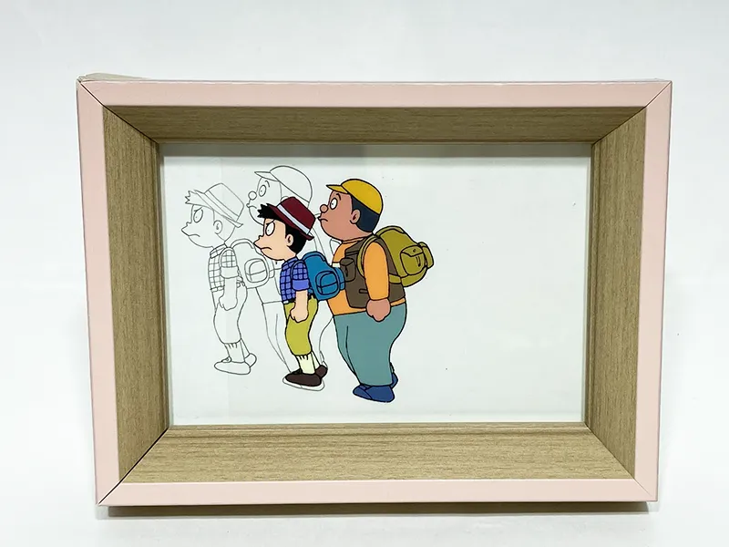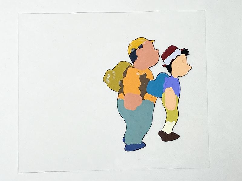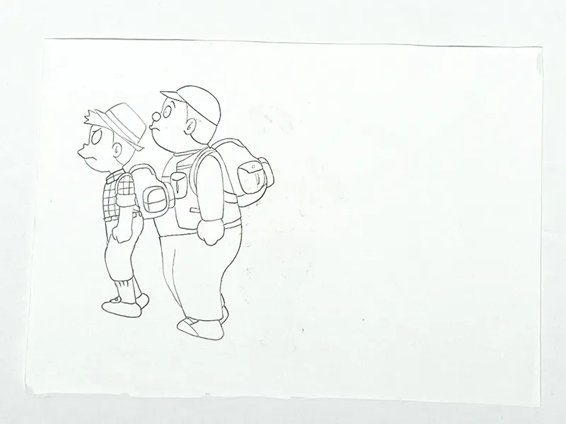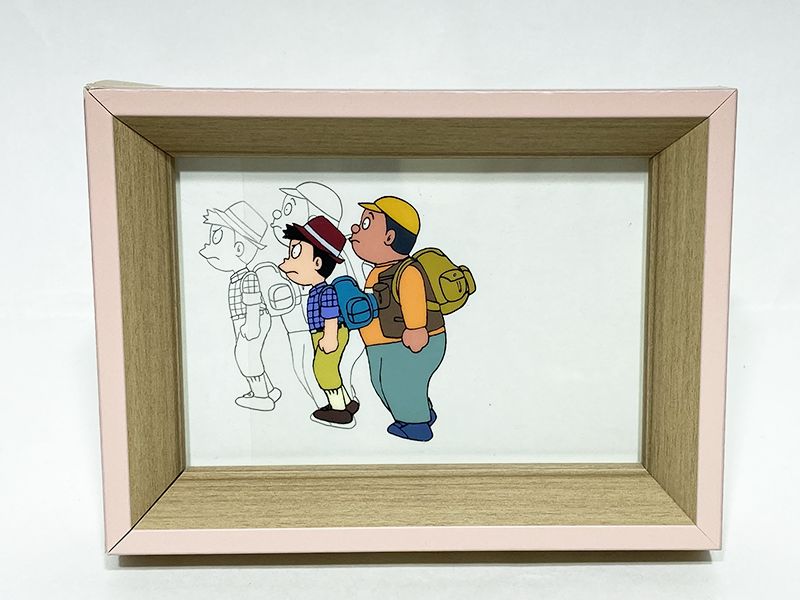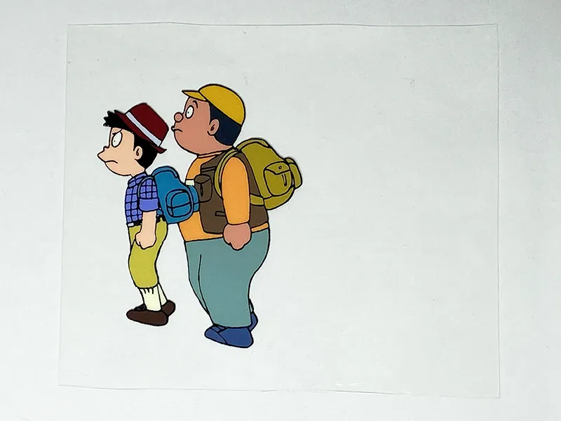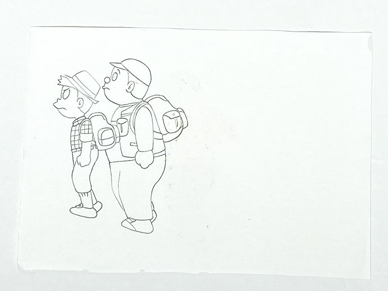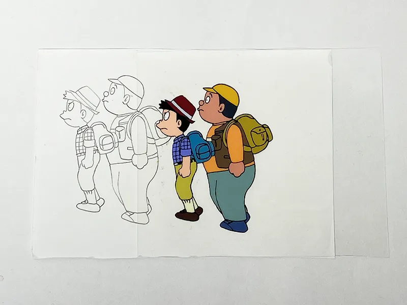 スネ夫とジャイアンが登場するキャンプ(山)シーンのカットで、実際のアニメ制作に使用されたセル画です。