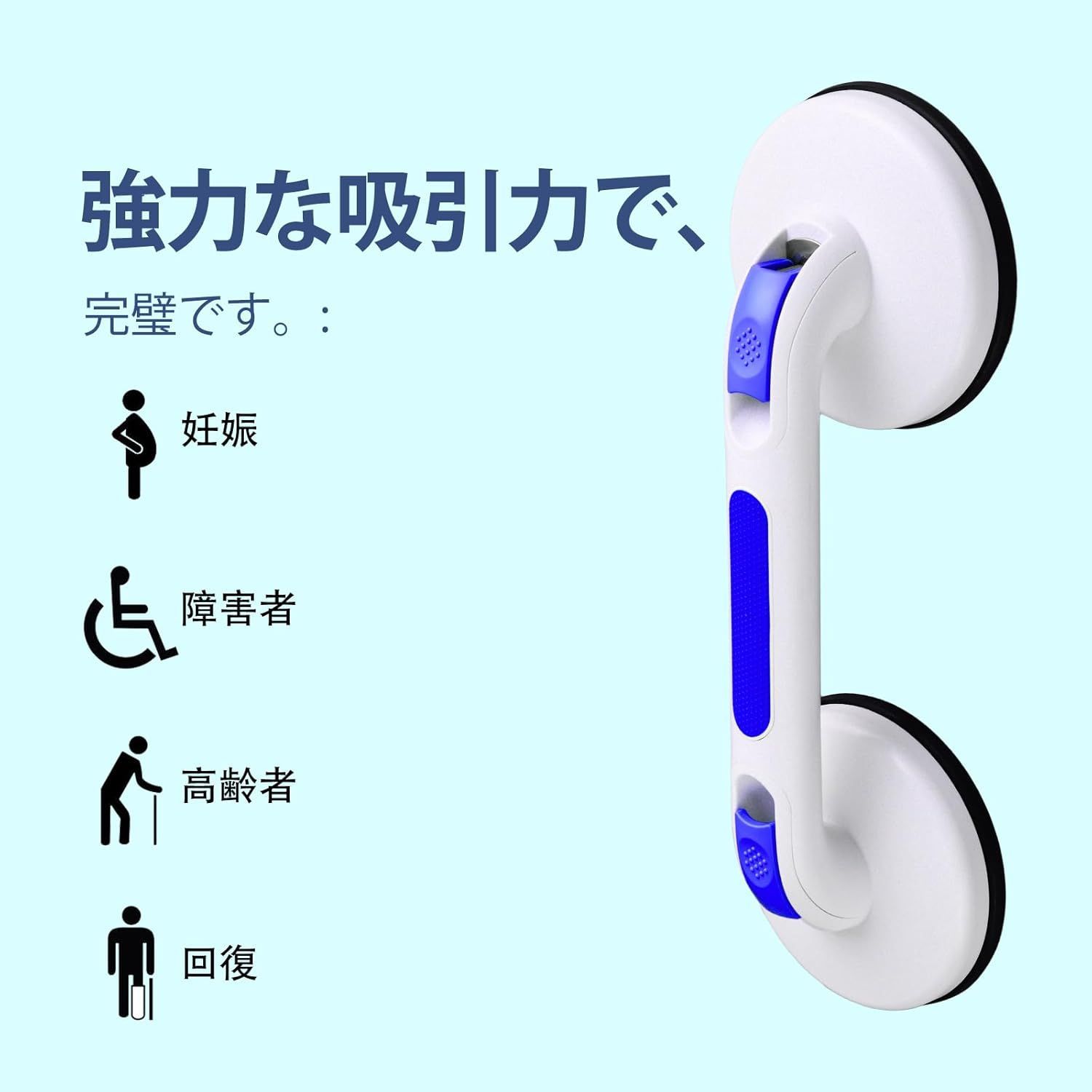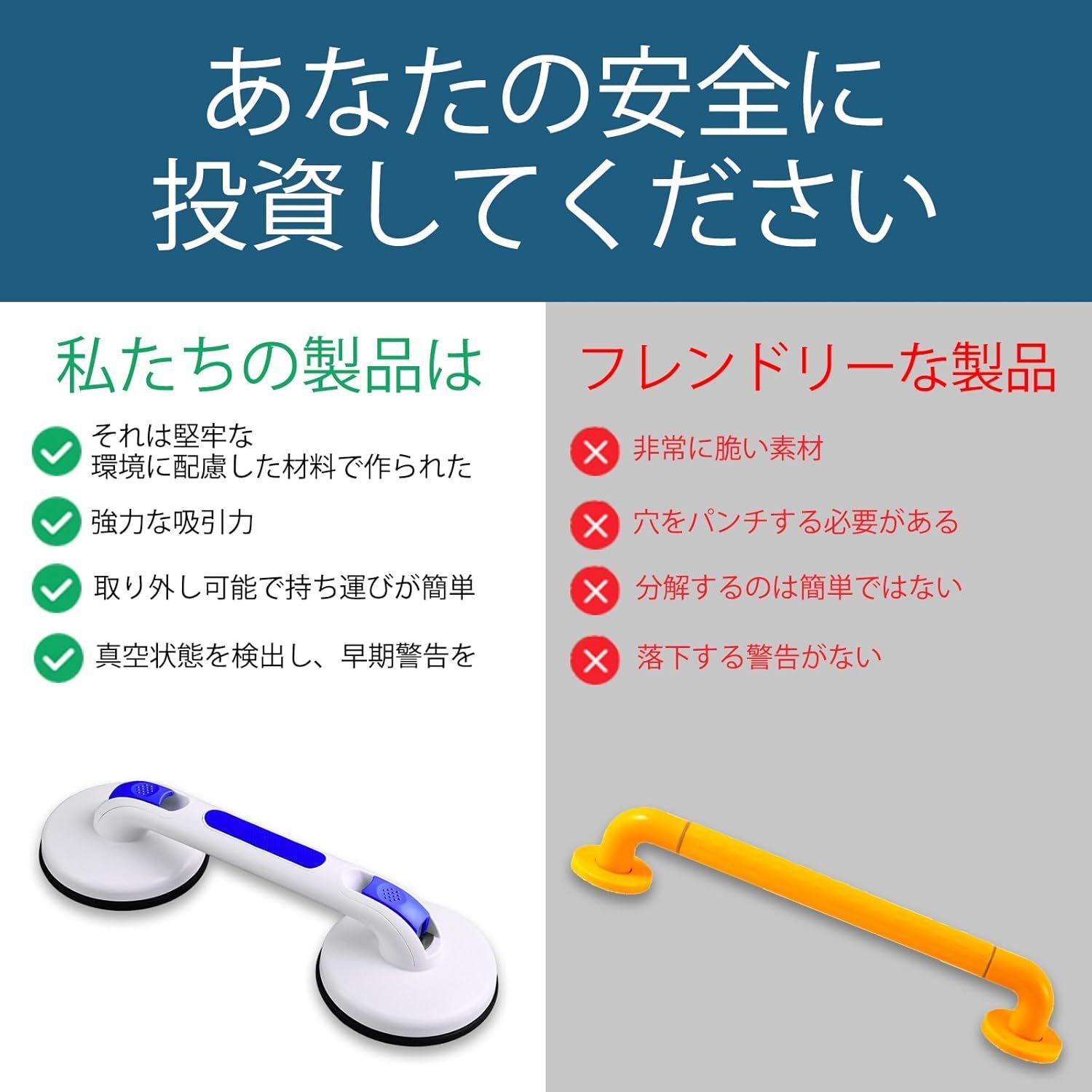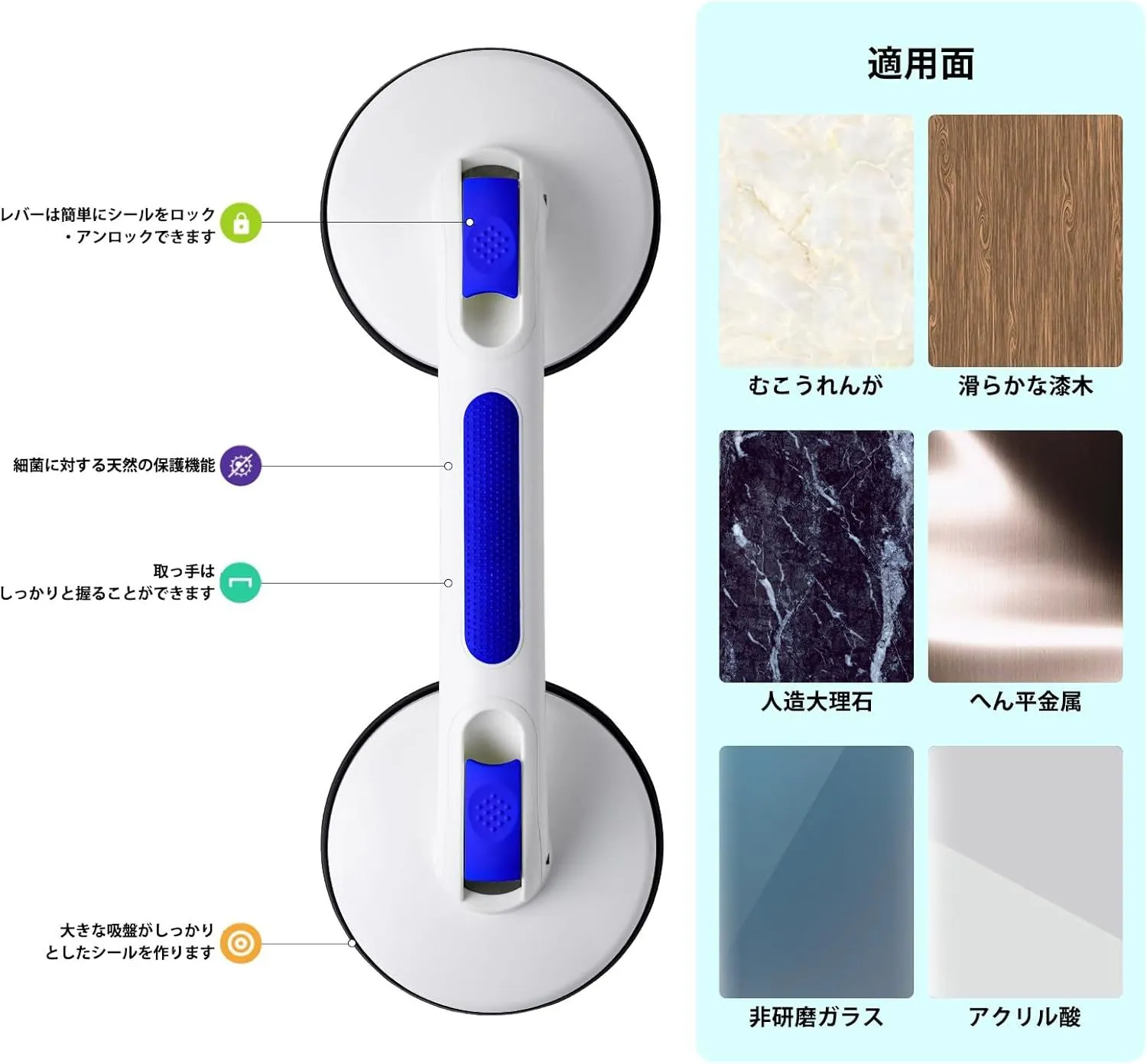 【重要注意事項】① 手すりは、人の体を適切に支えるためのものであり、全身重量をかけてはいけません。② 老人用吸盤つき手すりの取り付け面は、平らで、非多孔性、滑らかである必要があります。購入前にタイルとその間の距離を測定してください。吸盤は目地線上に重なることはできません。③ 定期的に吸盤の安定性を確認してください。使用する前に注意して吸盤の吸着力をテストしてください。