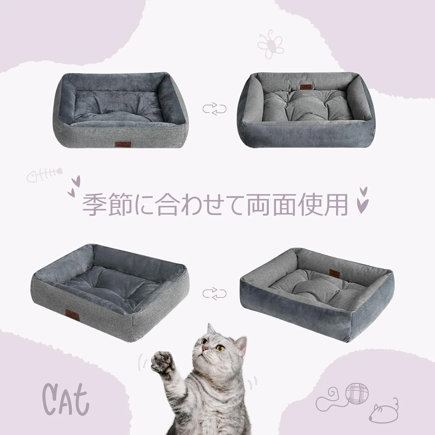 Hansleep 猫 ベッド 犬 ベッド 冬 ペットベッド ふわふわ クッション 両面用 S 通年 小型犬用 リバーシブル ぐっすり眠る キャット 猫用 ペット用品 (50L x 40W x 12H cm, グレー)