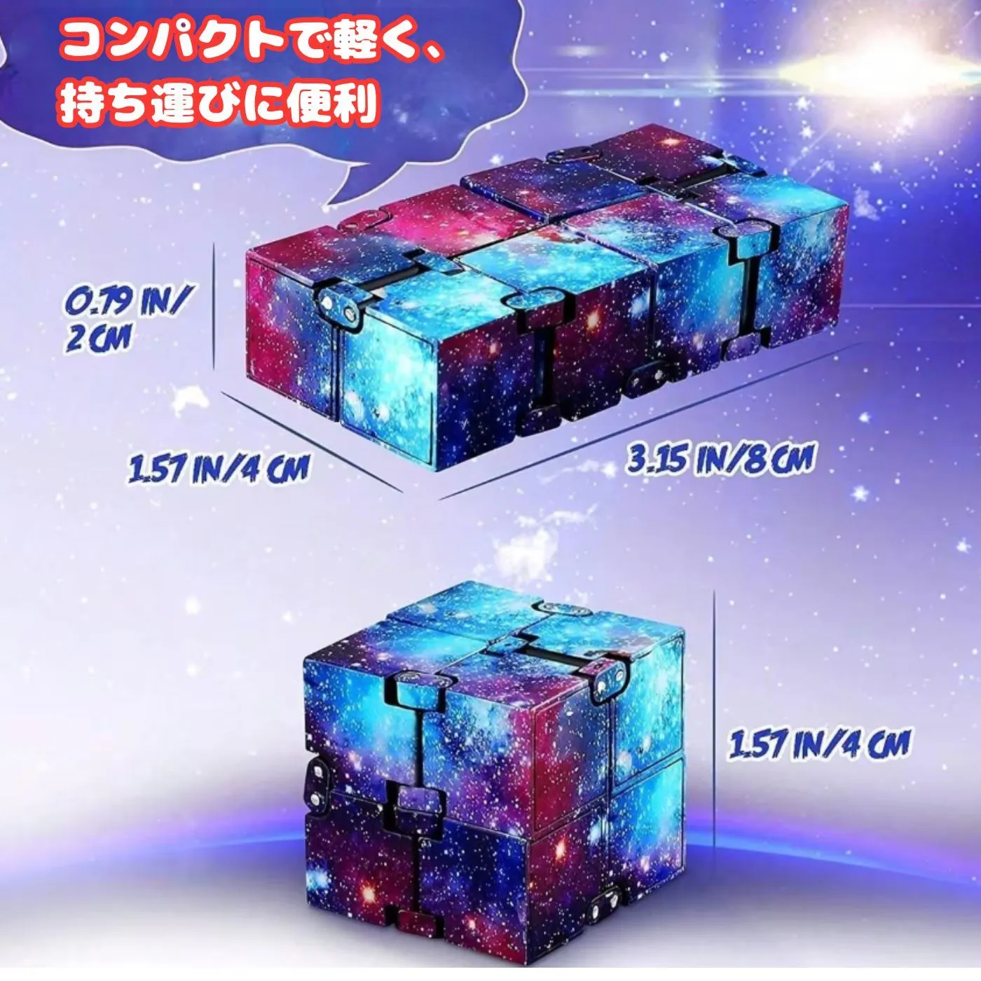 宇宙デザインが目を引く、折りたたみ式の無限キューブパズル。カチカチと形を変えながら無限に遊べる構造で、つい手が止まらなくなる中毒性が魅力です。コンパクトで持ち運びやすく、通勤・通学・待ち時間の暇つぶしやストレス解消に最適。大人も子供も楽しめる知育玩具として、集中力アップやリフレッシュにもおすすめの人気アイテムです。