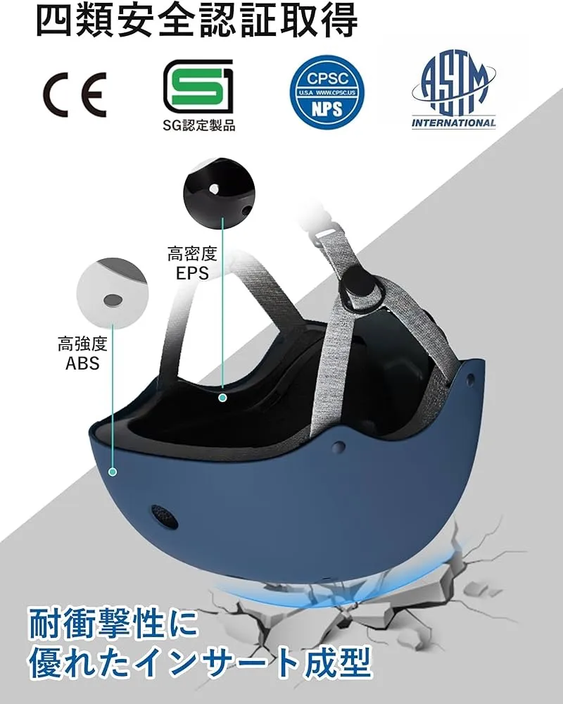 【SG認証 耐衝撃 道路安全法適合】本製品はS G認証、C E認定、CPSC規格、ASTM基準を満たしており、日本のみならず、国際的な安全基準をクリアしています。子供を全方面から護るため、ヘルメットのシェルは高強度で優れた耐衝撃性、衝撃吸収性能を持ち合わせたABS素材を採用し、インナーも衝撃吸収性能に優れた素材を採用しています。衝撃を受けた時に直ちに衝撃を吸収分散し、ケガの可能性を最小限に抑えます。どんなシチュエーションでも大切なお子様の頭部を外部の衝撃からお護りします。
