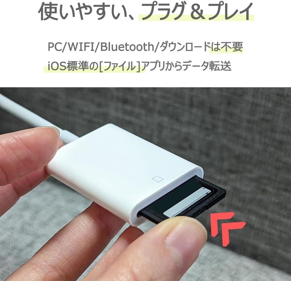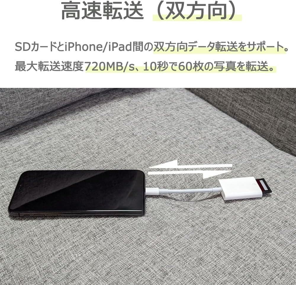 【Lightning SDカードリーダー】ユーザーがより簡単かつ迅速に写真を転送/保存/整理できるようにします。よく使われる用途:カメラ写真の転送、機種変更時のデータ転送、ファイルの保管。