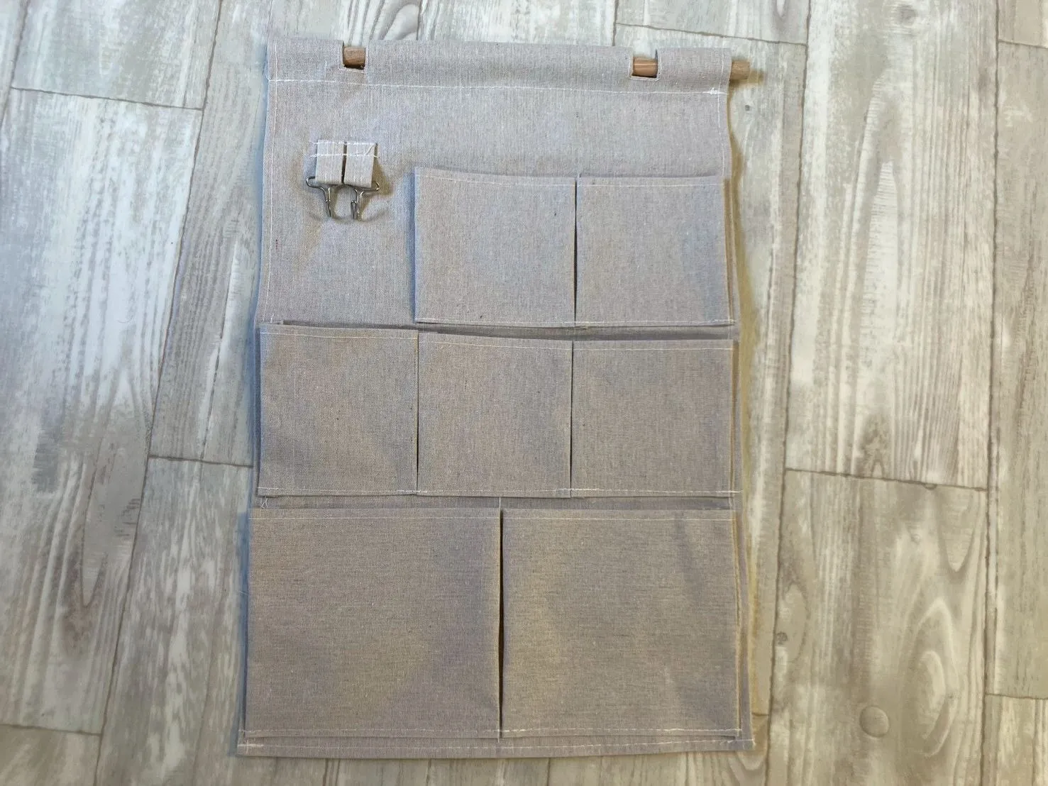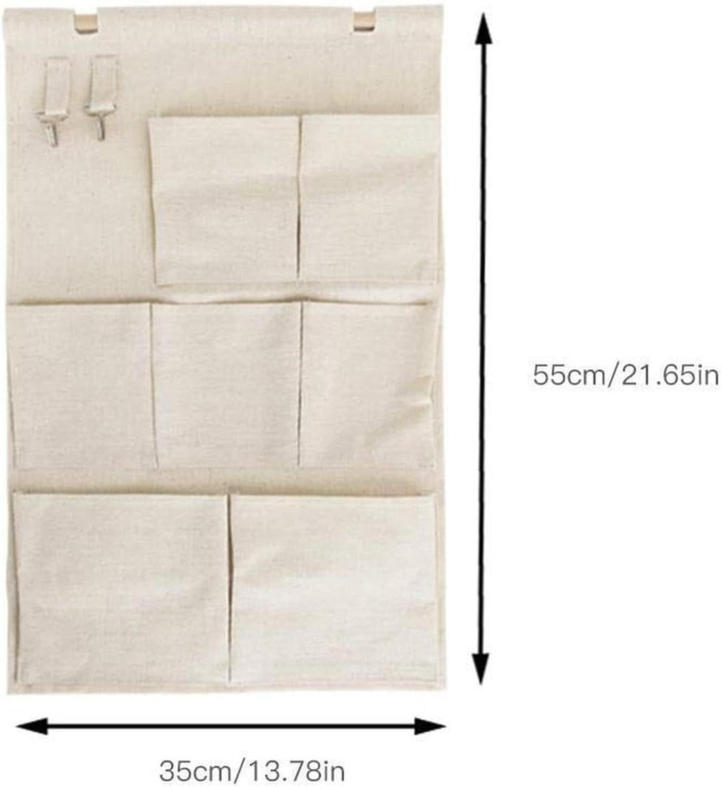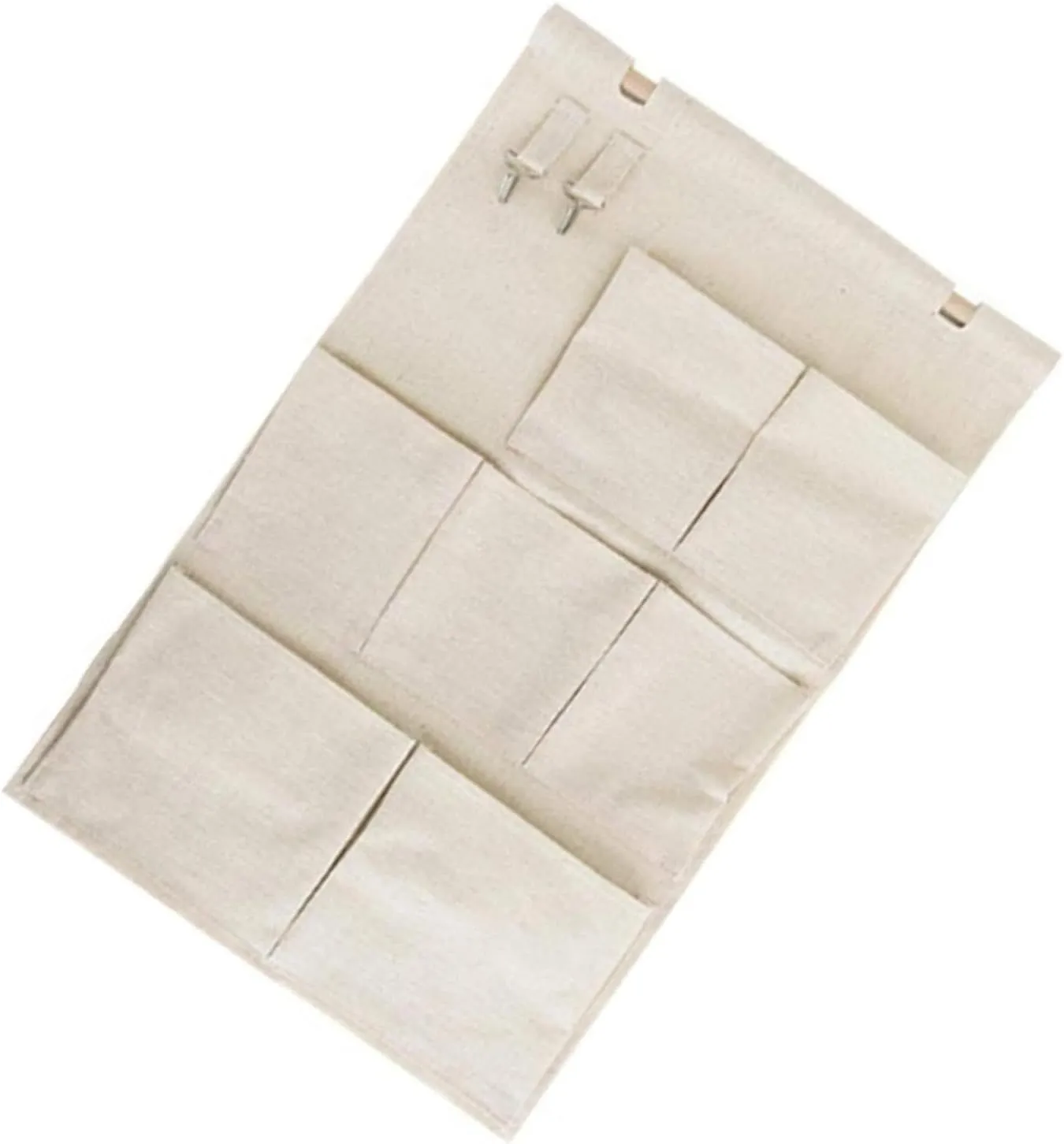 7個ポケットのバッグがあります。綿麻生地、バッグは金属フックが配置されます。お部屋、玄関、オフィス、リビングどこに設置しても違和感なく使えます。