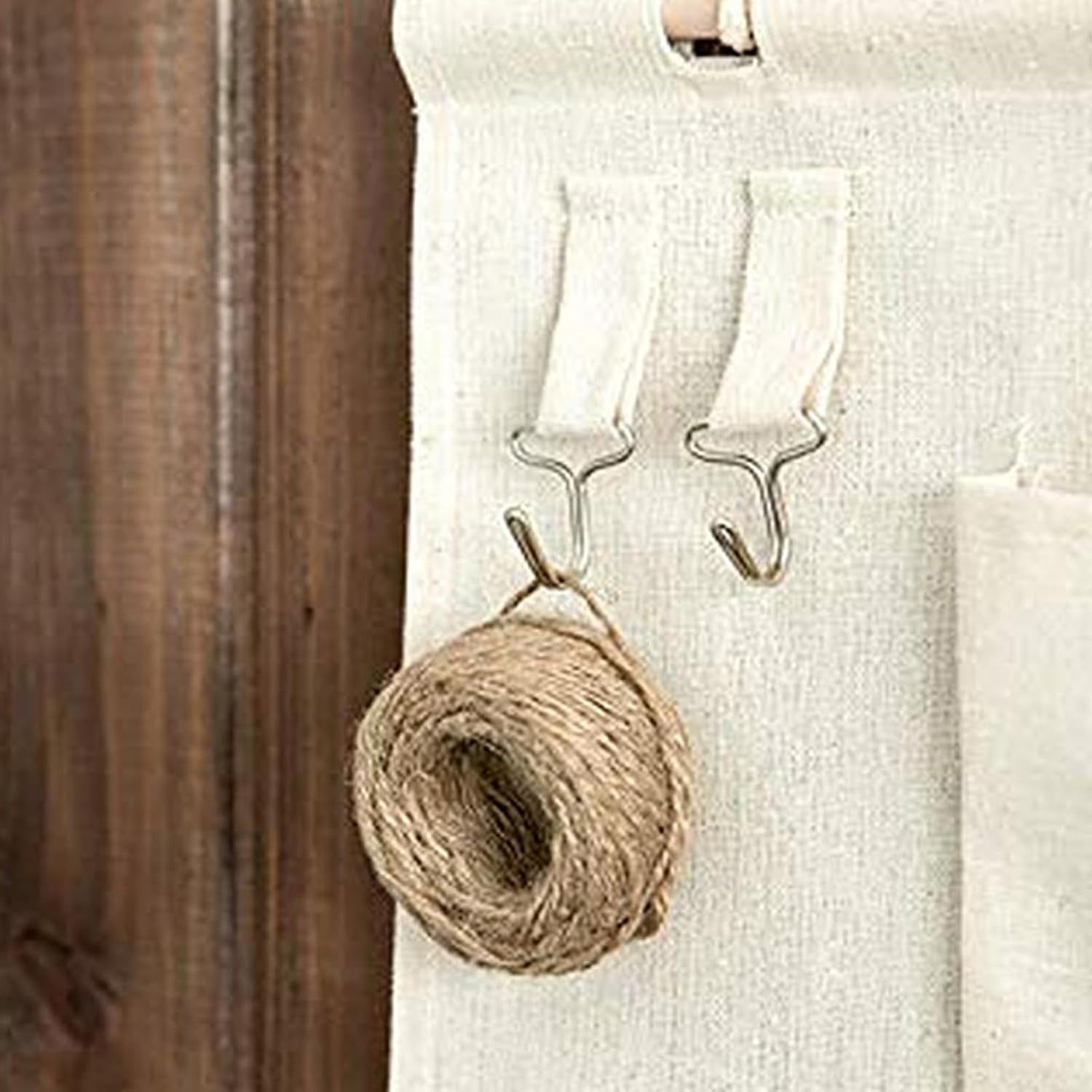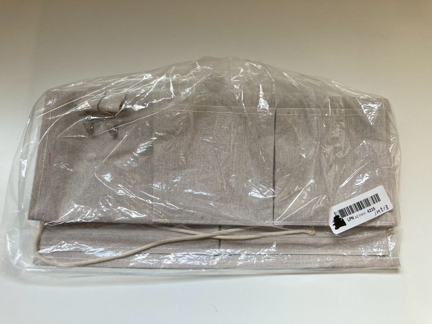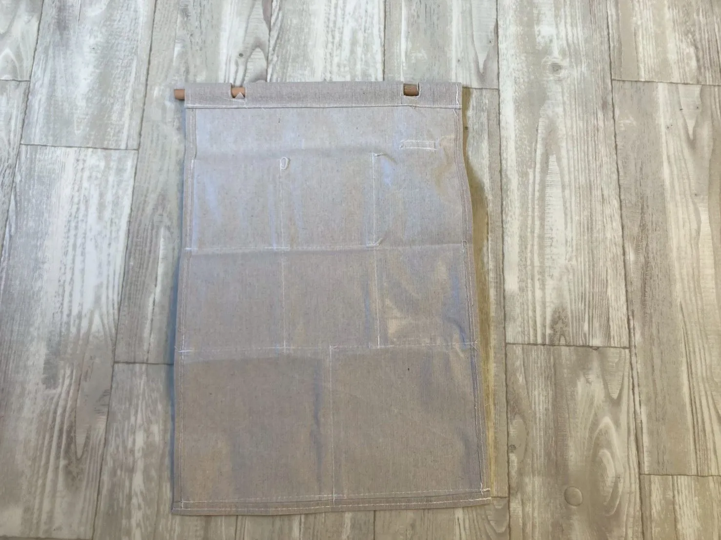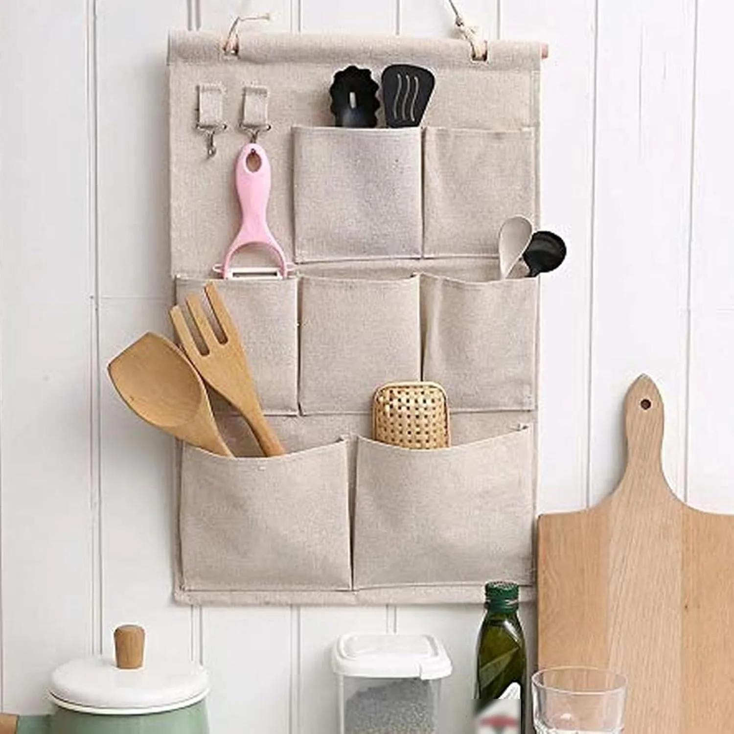7個ポケットのバッグがあります。綿麻生地、バッグは金属フックが配置されます。お部屋、玄関、オフィス、リビングどこに設置しても違和感なく使えます。