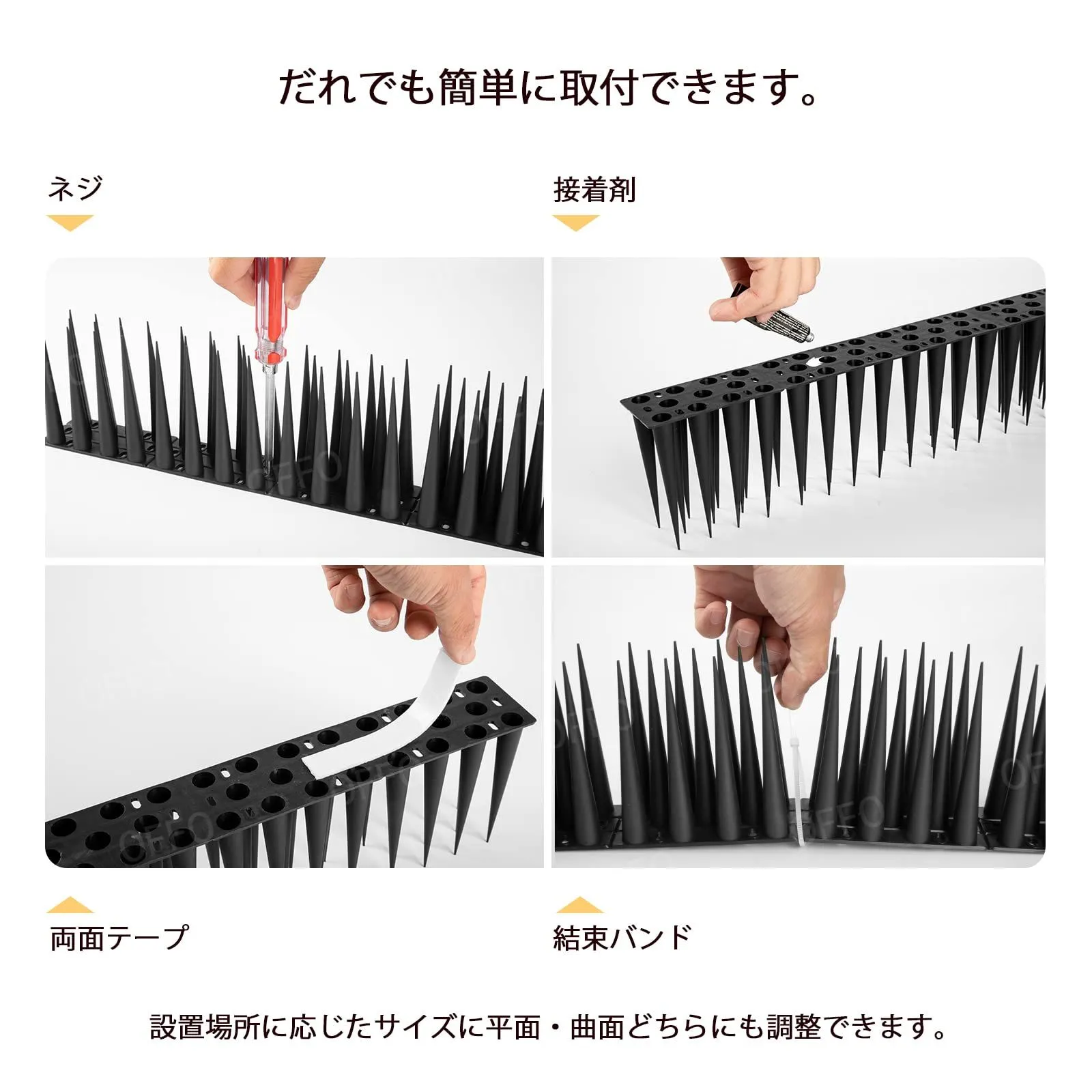 【最初にご確認ください】 初期不良等の際は評価前に取引メッセージにてご連絡お願い致します。 5日以内でしたら対応致します。 評価後の対応は致しませんのでご了承ください。 ショップ情報記載事項のご確認をお願いいたします。 Amazonのアウトレット品 開封後、中身の確認のみ 以下記載のASINをブラウザより検索し、Amazonページ参照ください ASIN:B0C2CDVKF1 ※アウトレット品の為、傷や汚れがある場合がございます。予めご了承ください。 [撃退効果強化 安全スパイク] 当店オリジナルなとげ高デザインを採用し、とげ高さは従来品より2倍以上長めました。足が長い鳥類も寄り付けできないです。また鳥類保護協会(RSPB)の要求に満足し、OFFO鳥よけマットは鳥を飛ばすための刺激を引き起こすだけなので、鳥や人に傷つけたり刺したりするほど鋭くないです。美観を損ねるフン害や不衛生、糞の臭いによる不快感、アレルギーや感染症による病気、金属類の腐食、騒音問題も一気に解決可能です。 [耐候性・耐久性抜群] 汎用樹脂の中で、最高の耐熱性を誇る高品質PP材を採用し、強度が高く、耐薬品(酸、アルカリを含む)性に優れ、吸湿性が無く、金属のように錆びたり、強い光で変形したりしません。常に強い紫外線にさらされる上、-20℃~80℃の低温、高温、豪雨、雪等過酷な環境でも長年使用でき、メンテナンスフリーで経済的です。 [どこでもタイプ 切って使える] 1シートにブロックが4つ連結されており、ハサミでカットして狭い場所にもお使いいただけます。手でグイっと押すと曲がり、6個セットでタテ・ヨコ、連結自在で設置場所に応じたサイズに平面・曲面どちらにも調整できます。 難しい工事は不要、接着剤、両面テープ、紐、結束バンド、ネジ(シートに穴あり)などで誰でも簡単に設置可能です。材質は柔らかくて、カンタンに曲げたりカットしたりすることができます。