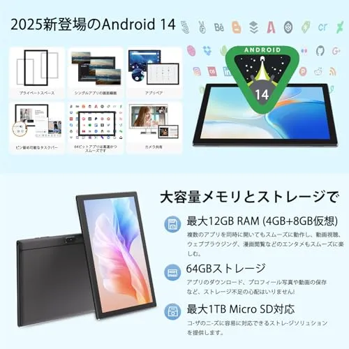 【RAM4GB8GB&ROM64GB】4GB物理メモリ8GB仮想メモリのRAMを搭載し、64GBの内蔵ストレージのROMに加え、最大1TBまでのMicroSDカードにも対応しています。堅牢なEMMC ROMを備えているので、スムーズなインターネットサーフィンを楽しむことができます。プリインストールされたGoogle PlayはFacebook、Twitter、YouTube,line、Instagramなど人気アプリなどを快適に利用できます。