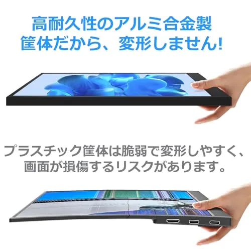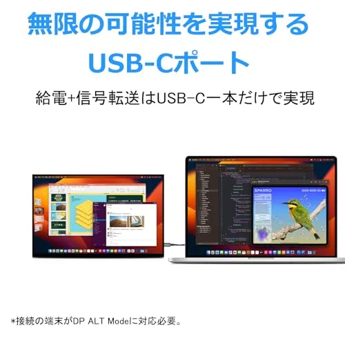 【USB Type-C採用! ケーブル1本でPCと接続できる!】「USB Type-Cディスプレイ給電」に対応しているので、添付しているUSB Type-Cケーブルで接続することにより、パソコン・スマホからの映像出力と給電がケーブル1本で行われます。電源コンセントに繋ぐ必要がないため、どこでも好きな場所でお使いいただけます。また、専用ドライバーも不要で購入後すぐにお使いいただけます。※パソコンに映像出力(DisplayPort Alt Mode)対応のUSB Type-Cポートが必要です。※給電が足りない場合は付属のACアダプターをご使用ください。