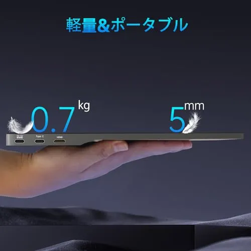 【薄型・軽量・持ち運び便利】ポータブルモニターは重量700g、最薄部5mmというスリムデザインで、旅行バッグにも簡単に収納できます。旅行や出張にも最適です。