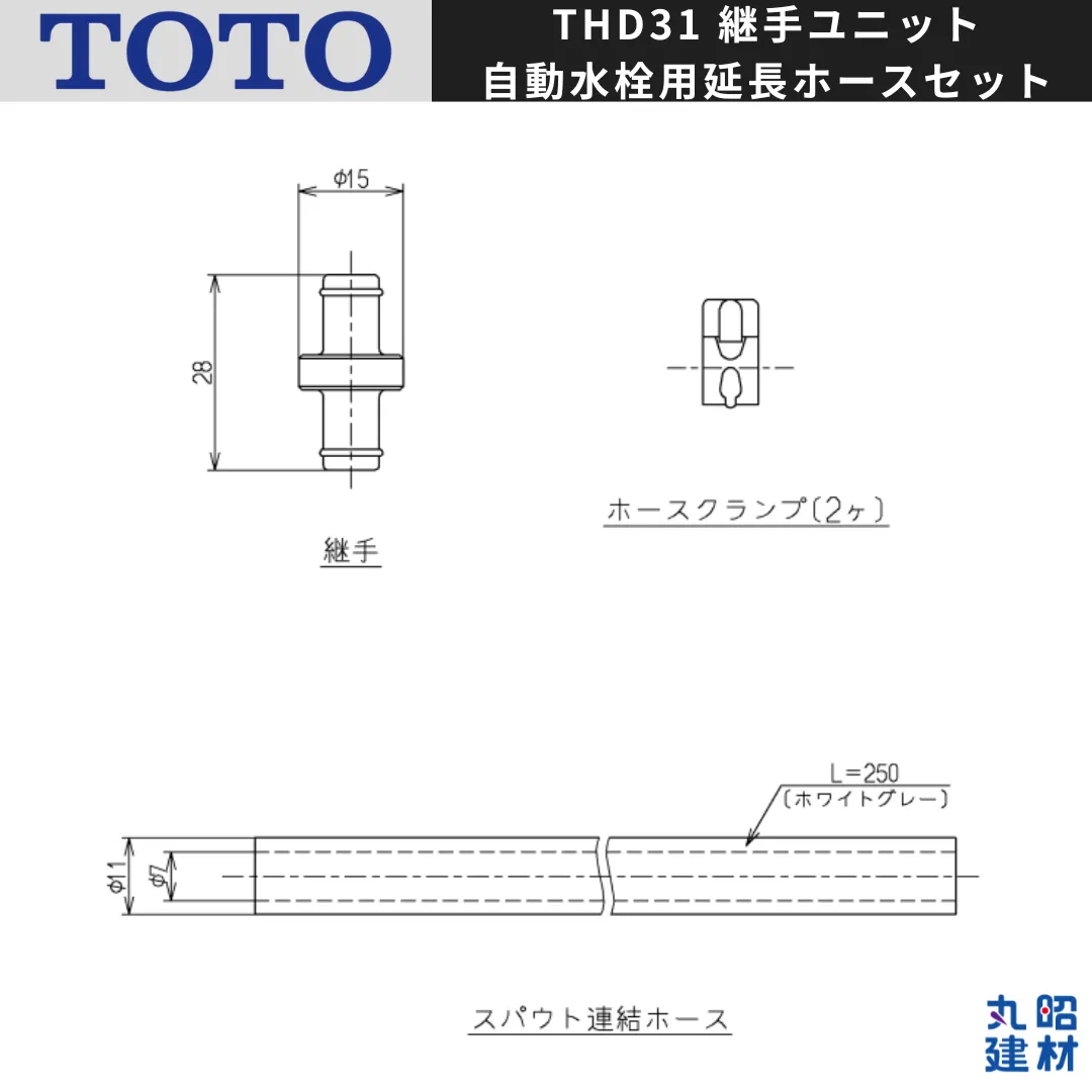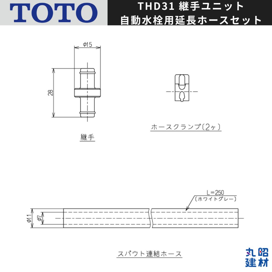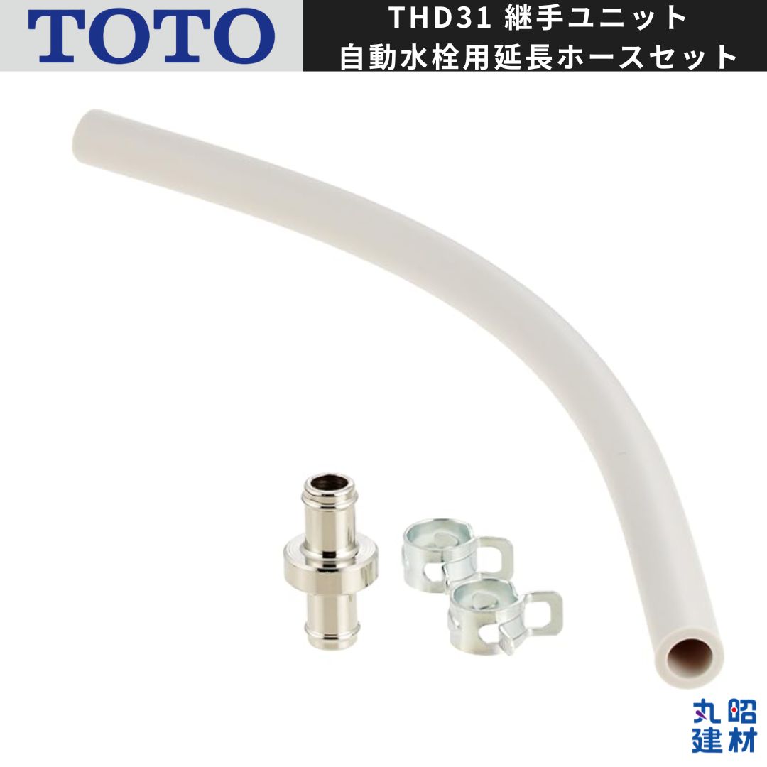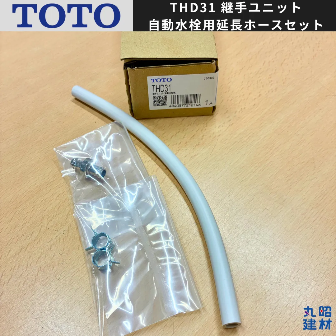 【新品未使用】TOTO THD31 継手ユニット 自動水栓用延長ホースセット TOTO洗面自動水栓アクアオートで使う給水ホースの延長セットです。 撮影のため開封しておりますが新品未使用品となります。説明書はございません。 ・品番:THD31 ・サイズ: ホース延長長さ250mm ・入数:1セット ・他社参考価格(新品):約¥1,460~¥1,650(送料別)