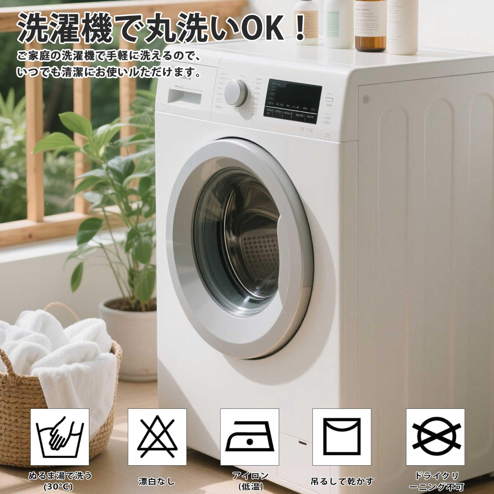 【洗えて長く清潔】丸洗いできる素材を使用しているため、汚れた時も家庭で簡単にお手入れいただけます。色落ちや縮みに配慮した加工を施しており、繰り返し洗濯後も美しい見た目と機能性をお楽しみいただけます。洗濯機で洗えてすぐに乾くので、お手入れも手間いらず。※漂白剤のご使用やアイロンがけはお控えください。