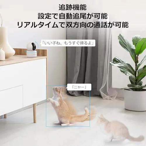 【動体検知自動追尾】この監視カメラは、頼れる留守番役となります。自動追尾機能により、お家族やペットを常に目の届く範囲で見守ることができます。動体検知機能も搭載されており、防犯にも活用できます。動きを検知すると自動的に追尾し、ユーザー様のスマホに通知します。不審者には警告アラームを鳴らすことも可能です。防犯機能の設定は自由に調整できます。
