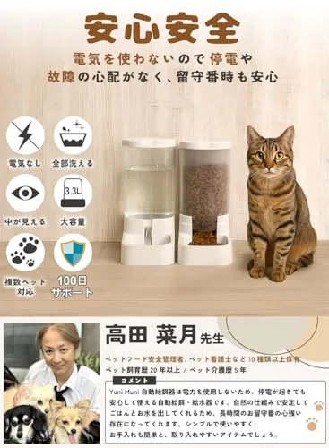 【電気なしで安心安全】電気を使わないから停電や故障の心配なし。自然の仕組みで安定して水とフードを供給し、長時間の留守番も安心。ペット飼育歴20年以上の専門家も推奨する、シンプルで清潔に保てるアイテムです。