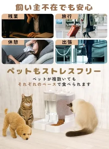 【留守中も安心】残業や旅行、出張時でも水とフードを自動補充。複数のペットも自分のペースで食べられてストレスフリー(多頭飼いOK)。