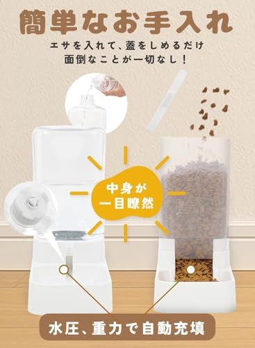 【お手入れ簡単】フタを開けて水やフードを入れるだけ。自動給餌器(自動給水器)中身が見える透明タンクで残量チェックも簡単。水圧と重力で自動補充され毎日ラクラク。