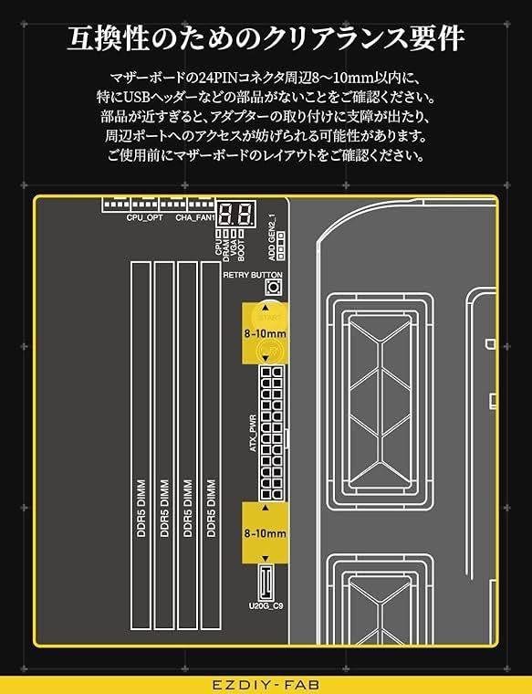 【カラー】 ホワイト シールドをイメージした印象的なデザイン:シールドの堅牢さに着想を得た無限ミラーエフェクトを体験してください。この洗練されたデザイン要素は、システムのビジュアルハーモニーを強調しつつも、主張しすぎません。 効果的なケーブル管理とストレインリリーフ設計:柔軟な180度の配置により、ケーブルの整理が簡単で効率的になり、設置時の煩雑さを減らします。また、このアダプタはマザーボードコネクタへの負荷を最小限に抑えます。メスコネクタとケーブル配線ホールの距離にご注意ください。 高導電性端子と汎用性のある互換性:合金銅端子を採用し、安定した大電流出力を保証し、熱の蓄積を防ぎます。ATX 3.1規格に準拠し、将来を見据えたコンポーネントとして使用できます。ATX、mATX、ITXのマザーボードと互換性があります。 魅力的なARGBライティング:無限ミラーとシールドパネルのRGBライティングが、魅惑的なARGBレインボーカラーでビルドを彩り、柔らかな環境光が美観とユーザー体験を向上させます。 ブラックとホワイトから選択可能: ビルドの美観に完璧にマッチする 2 つのクラシックな色から選択して、視覚的に統一された強力なセットアップを実現します。 購入前にクリアランスを確認してください:購入の際は、マザーボードの24ピンコネクタとPCケースの配線用ホールとの間に十分なスペースがあるか確認し、設置の干渉を避けてください。付属の寸法情報を使用して、配線がスムーズに行えるように確認してください。 注意 : 24ピンATXコネクタと隣接するマザーボードのコンポーネント(例:USBポートなど)の間のクリアランスが、理想的には8〜10mm以上確保されていることを確認してください。 ※ 一度開封しておりますが未使用美品! 念入りに検品していますが、見逃しがある場合がございます。受け取り評価後のクレームに関しては対応できかねますので、何かあれば評価前にご連絡ください。