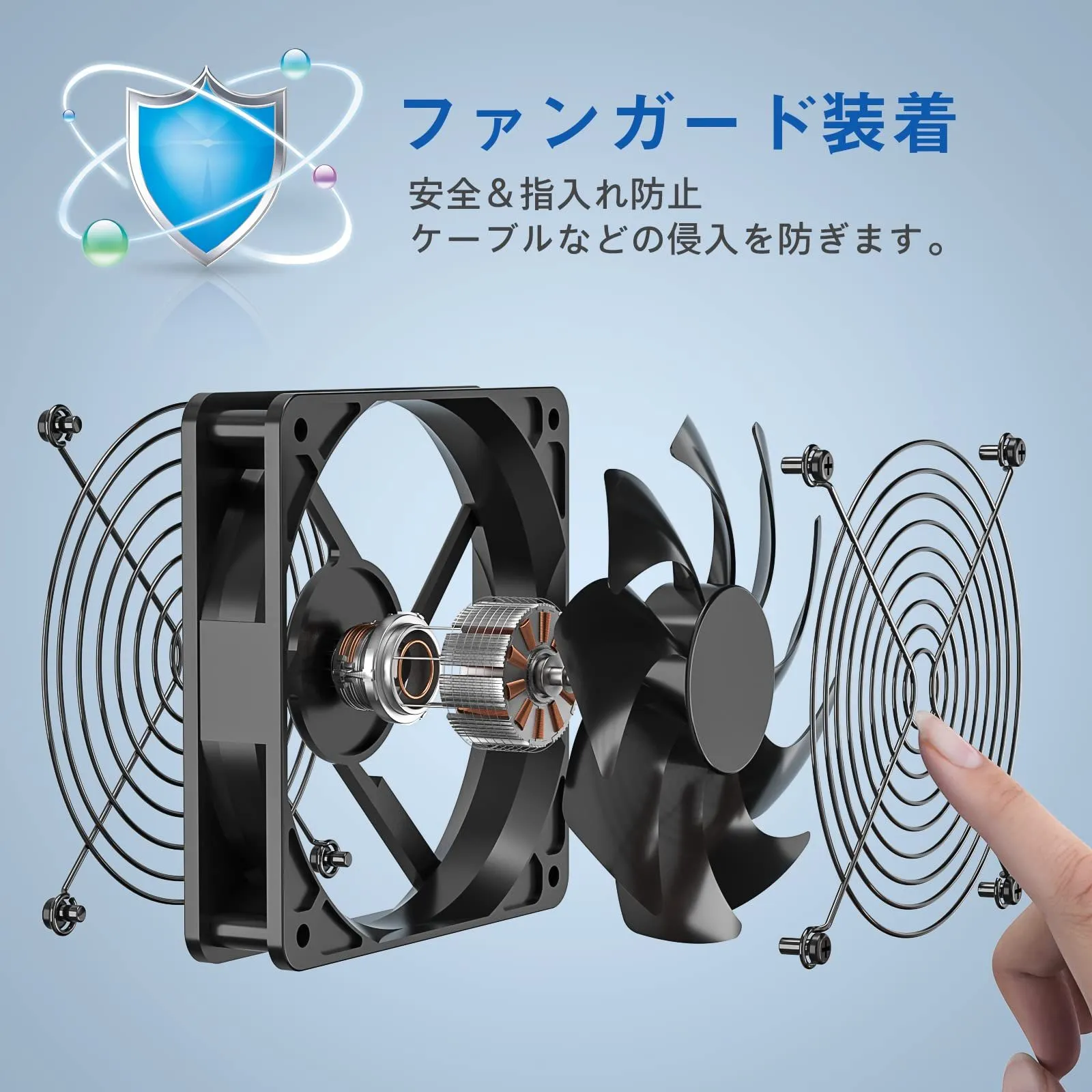 【究極の静音設計・安全性へのこだわり】 高品質なモーターを採用し、図書館やオフィスでも気にならない静音性を実現。両面には金属製のファンガードを装着しており、指の巻き込みやケーブルの干渉を防ぎます。底面には滑り止めゴム足が付いているため、縦置き・横置きどちらでも安定して使用可能です。