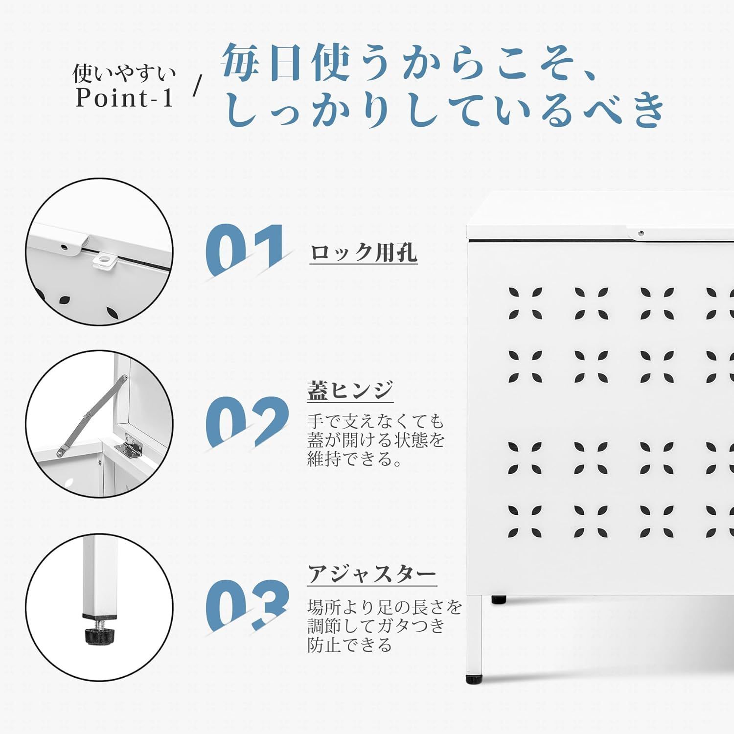 【素材】材質: 亜鉛めっき鋼板。表面に防錆塗料を使用しますが、耐久力が強くて長めにお使いことができます。周りにも通気孔があり、ゴミからの臭みをよく消します。またクッションパッド付きますので、蓋を閉めたときの衝撃を和らげ、静かに開け閉てできます。