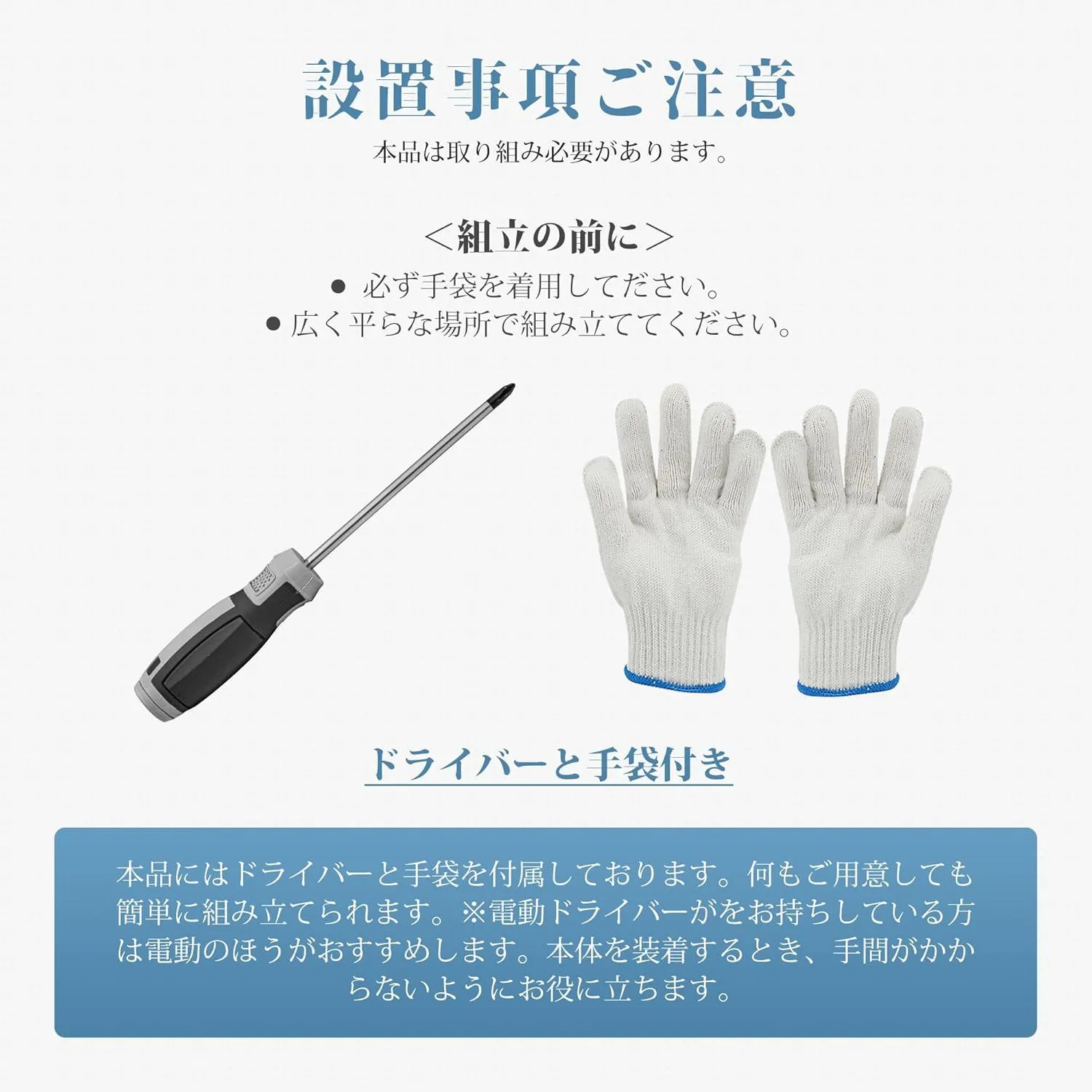 【ご注意】本品は取り組み必要があります。作業中に必ず軍手を付けてケガをしないよう気をつけてください。脚部は高さ調節が可能で、安定性にも優れています。