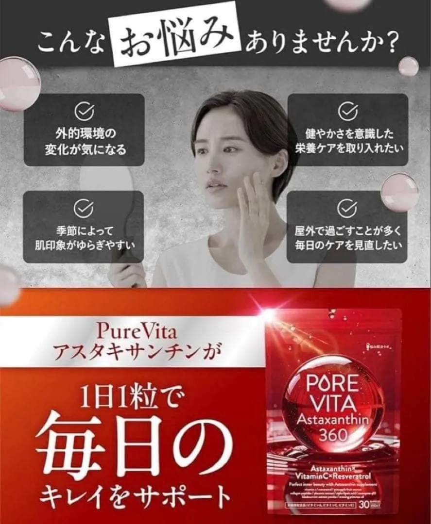 【飲む アスタキサンチン 12mg】ピュアビタ アスタキサンチン 360 サプリ ビタミンC レスベラトロール 30日分 18種 美容サポート成分 パイナップル果実抽出物 トマトエキス コラーゲンペプチド プラセンタ カシスエキス 国内製造 悩み解決ラボ