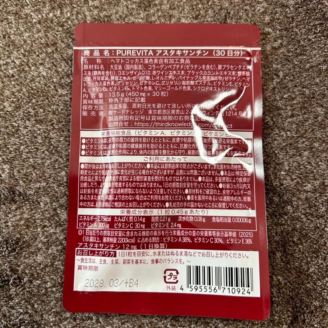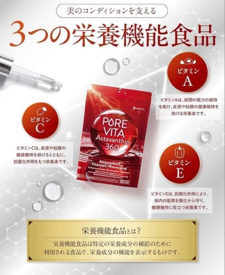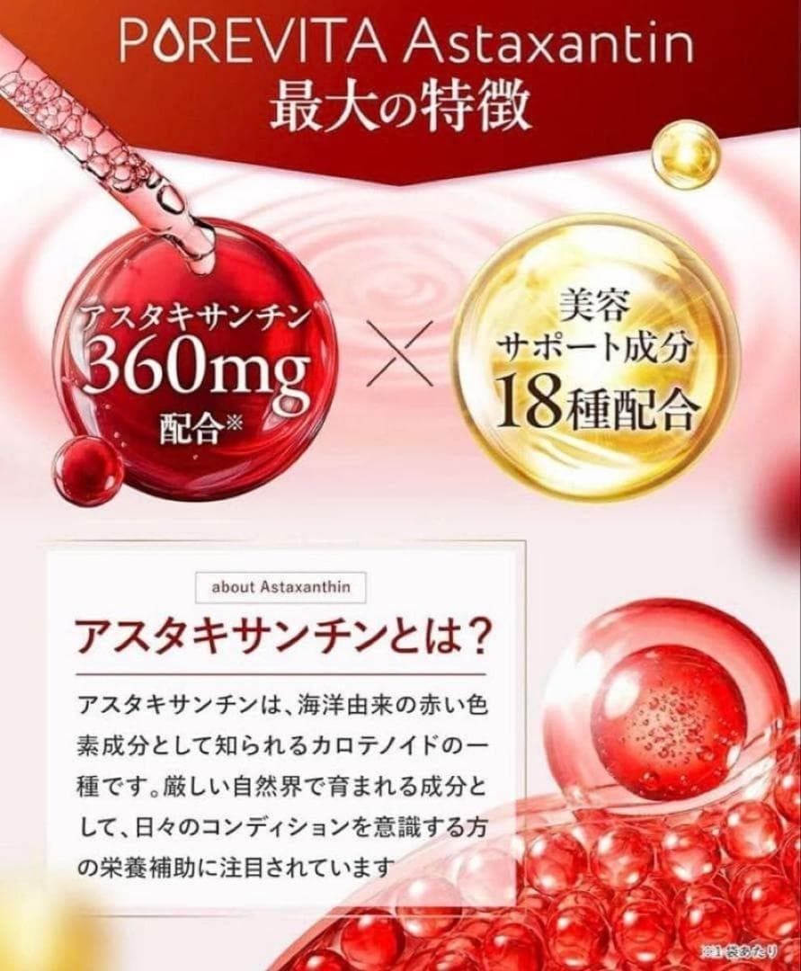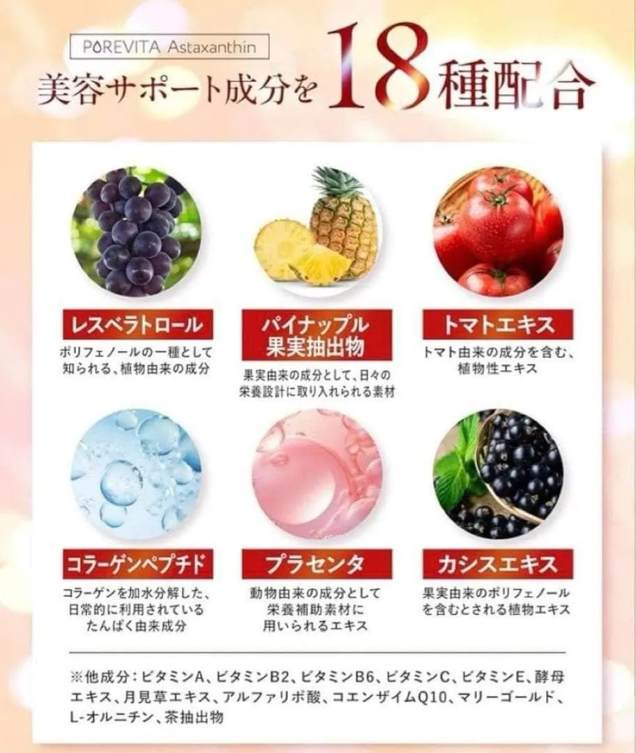 - 成分: アスタキサンチン, ビタミンC, ポリフェノール
