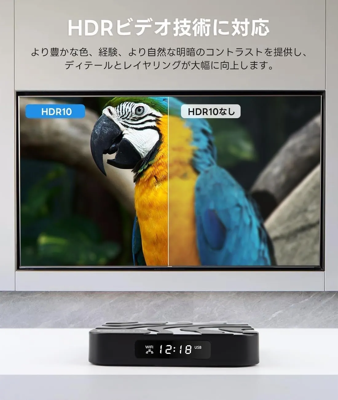 【高速チッププロセッサー】 ホストには高速チッププロセッサが搭載されており、解像度と実行速度が向上し、より良いビデオ体験を楽しむことができます。 HDR ビデオ技術をサポートし、より豊かな色、体験、明暗間のより自然なコントラストを提供し、画像の詳細とレイヤーを大幅に強化します。