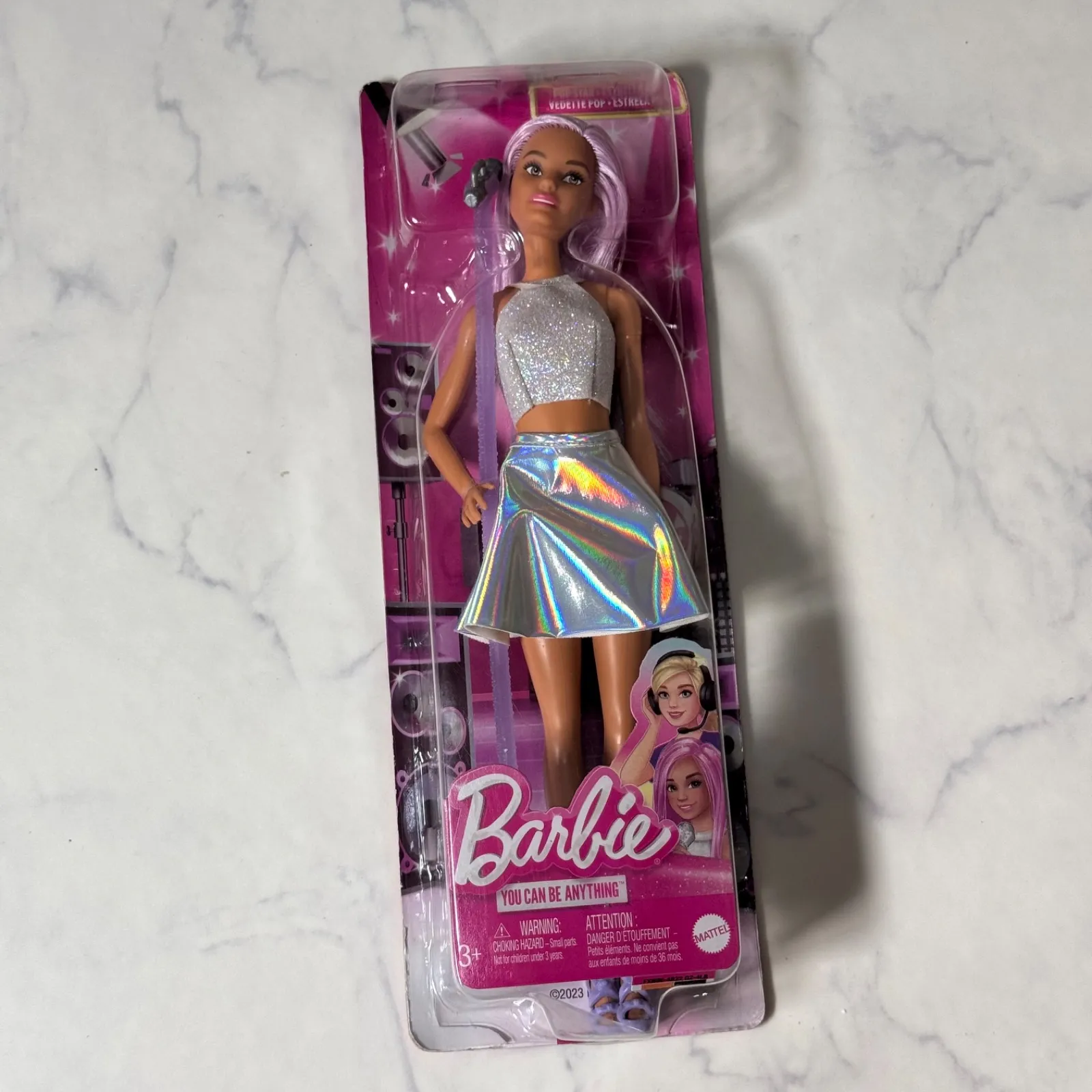 【商品説明】 マテル社(Mattel)の「Barbie You Can Be Anything(なりたい自分になれる)」シリーズより、華やかなポップスターのバービーです! • 輝くステージ衣装: シルバーのラメトップに、光の加減で虹色に輝くホログラムのスカートがとってもキュートです。 • チャームポイント: 鮮やかなパープルカラーのロングヘアが特徴的で、お子さまへのプレゼントはもちろん、コレクターの方のディスプレイにも映える一体です。 • 付属品: ステージには欠かせないマイクスタンドがセットになっています。 お子さまのごっこ遊びや、お部屋のインテリアとしていかがでしょうか?