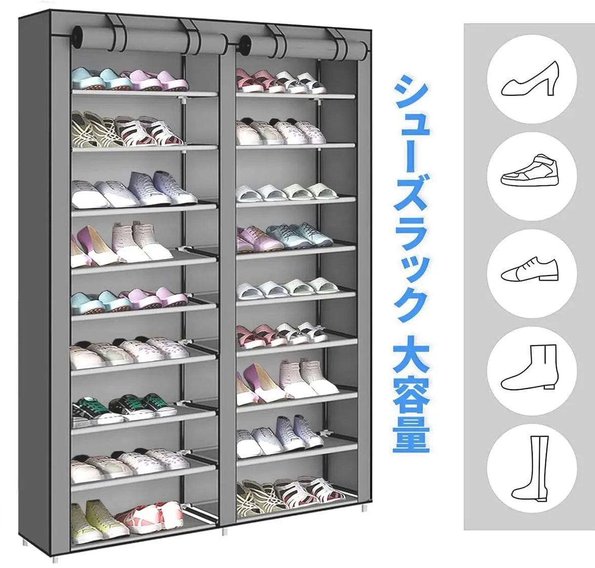 【高品質シューズラック】: 1.パイプ - 直径13mmのプラスチックをコーティングした太い鉄パイプ、防錆、丈夫で長持ち、耐荷重能力が優れるなどの特徴があり、長く使っても変形しにくいので、安心してご利用いただけます。2.埃やカビやダニから靴を守る不織布カバー付きで、来客時の目隠しにも最適です。靴の収納に関する様々な悩み一気に解決!3.ジョイント - 高強度環境配慮型PPプラスチック材料で作られ、耐摩耗性、安定性が優れたから、パイプをしっかり支え、横揺れしないようにします。