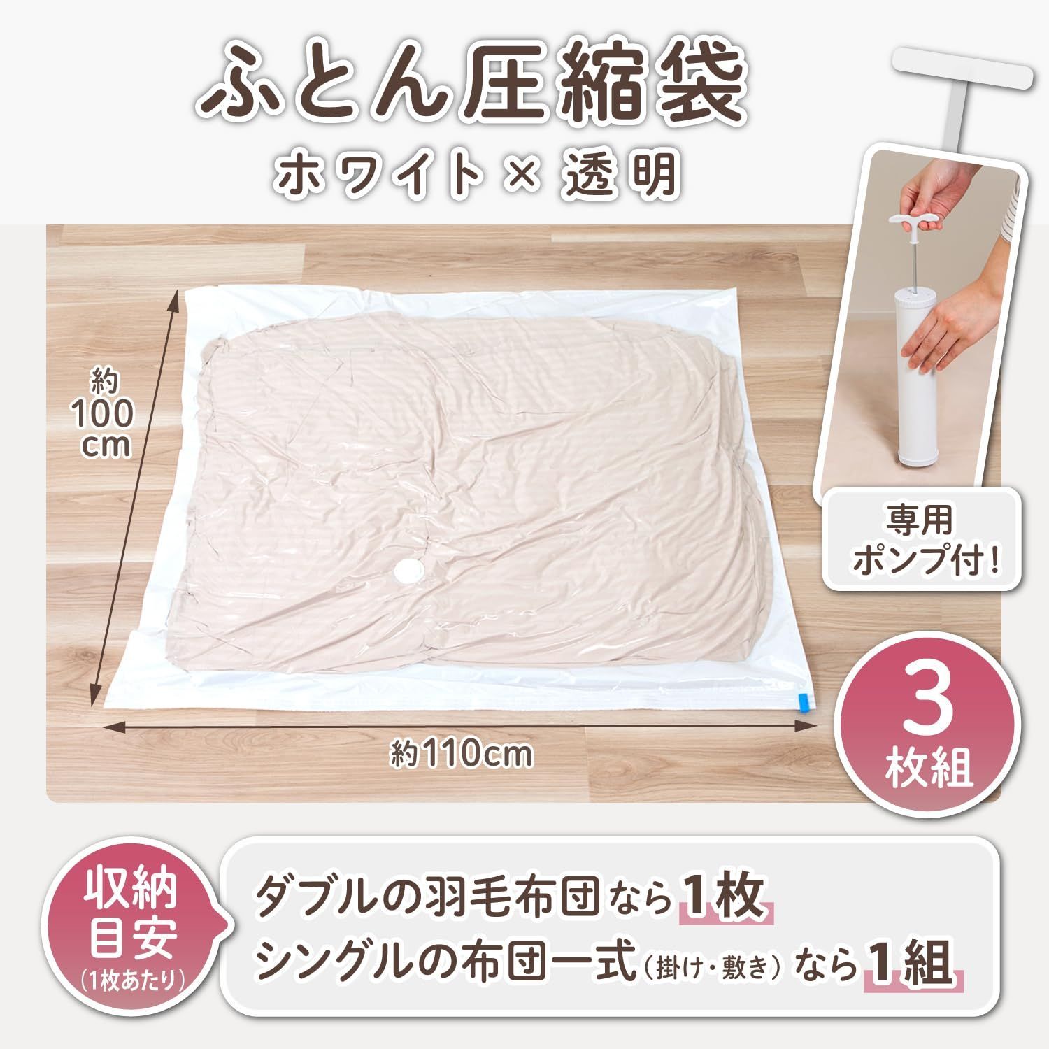 【商品仕様】:サイズ/圧縮袋:約100×110cm・手動ポンプ:約24×7×5.5cm、内容/圧縮袋3枚・手動ポンプ1個