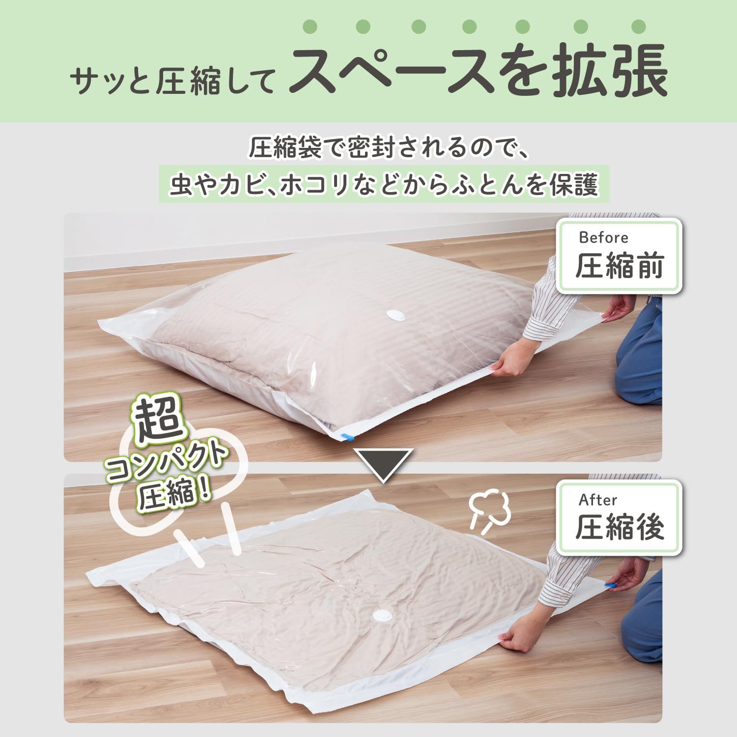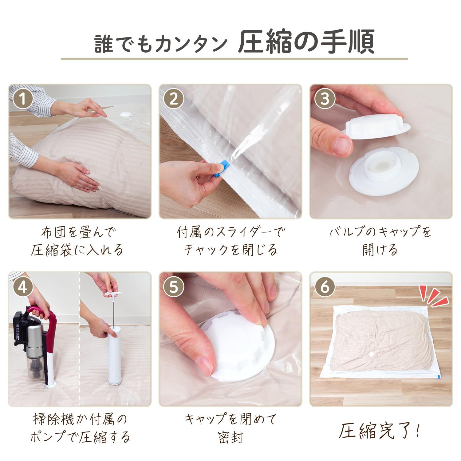 ●付属の専用ポンプは圧縮の仕上げでのご使用がおすすめです。 掃除機の拭き戻しによるホコリや雑菌の侵入を防止。掃除機への負担を軽減します。