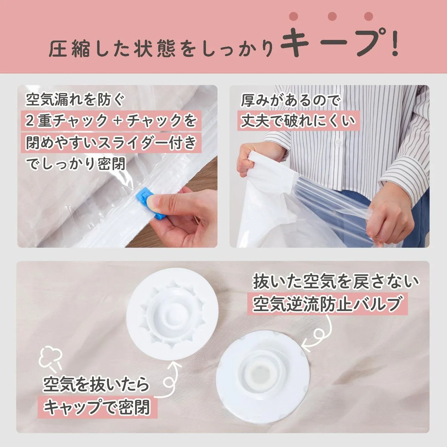 【丈夫な生地】:85ミクロンフィルムを使用した厚みのある生地。 空気漏れを防ぐ二重チャック構造+専用スライダー付きでしっかり密閉。
