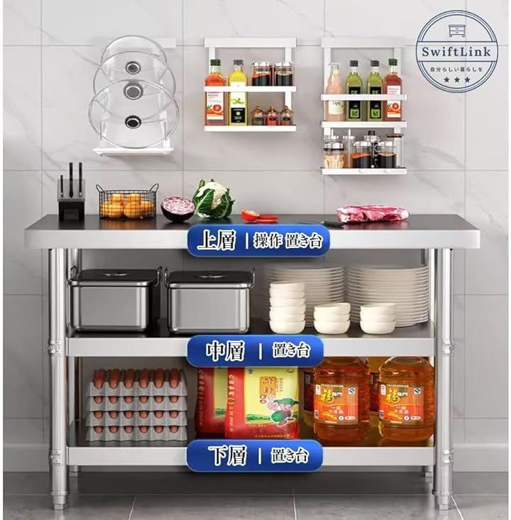SwiftLink ステンレス 作業台 3段 業務用 調理台 ワークテーブル キッチン置き棚 作業テーブル 台所 厨房 飲食店 家庭用 超耐荷重 頑丈 安定性 組立簡単 (シルバー, 幅90cmx奥行50cmx高さ80cm)