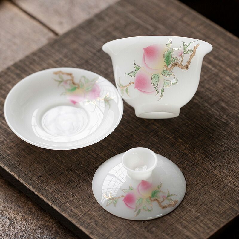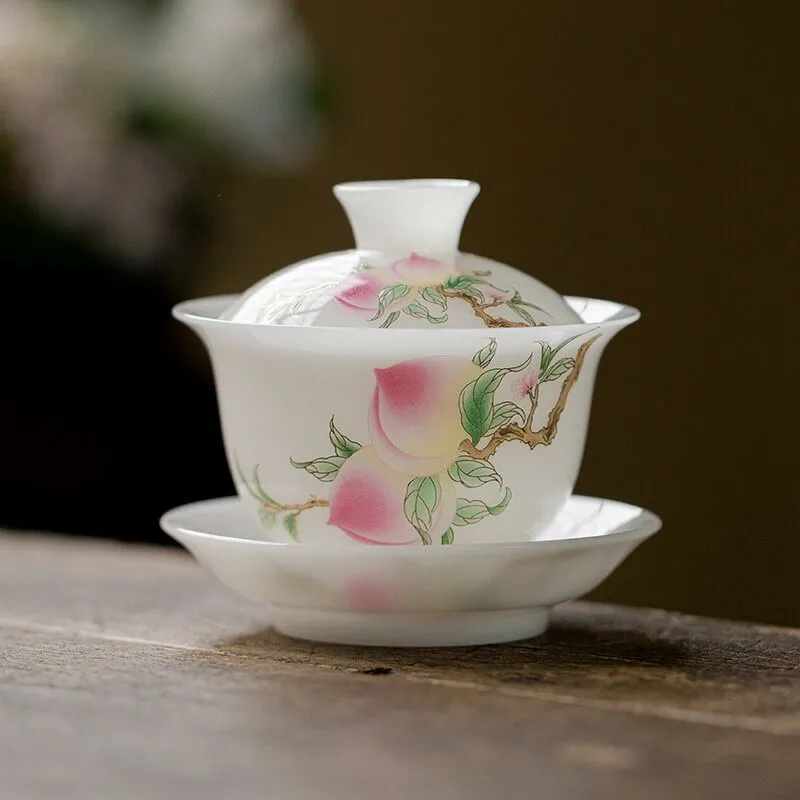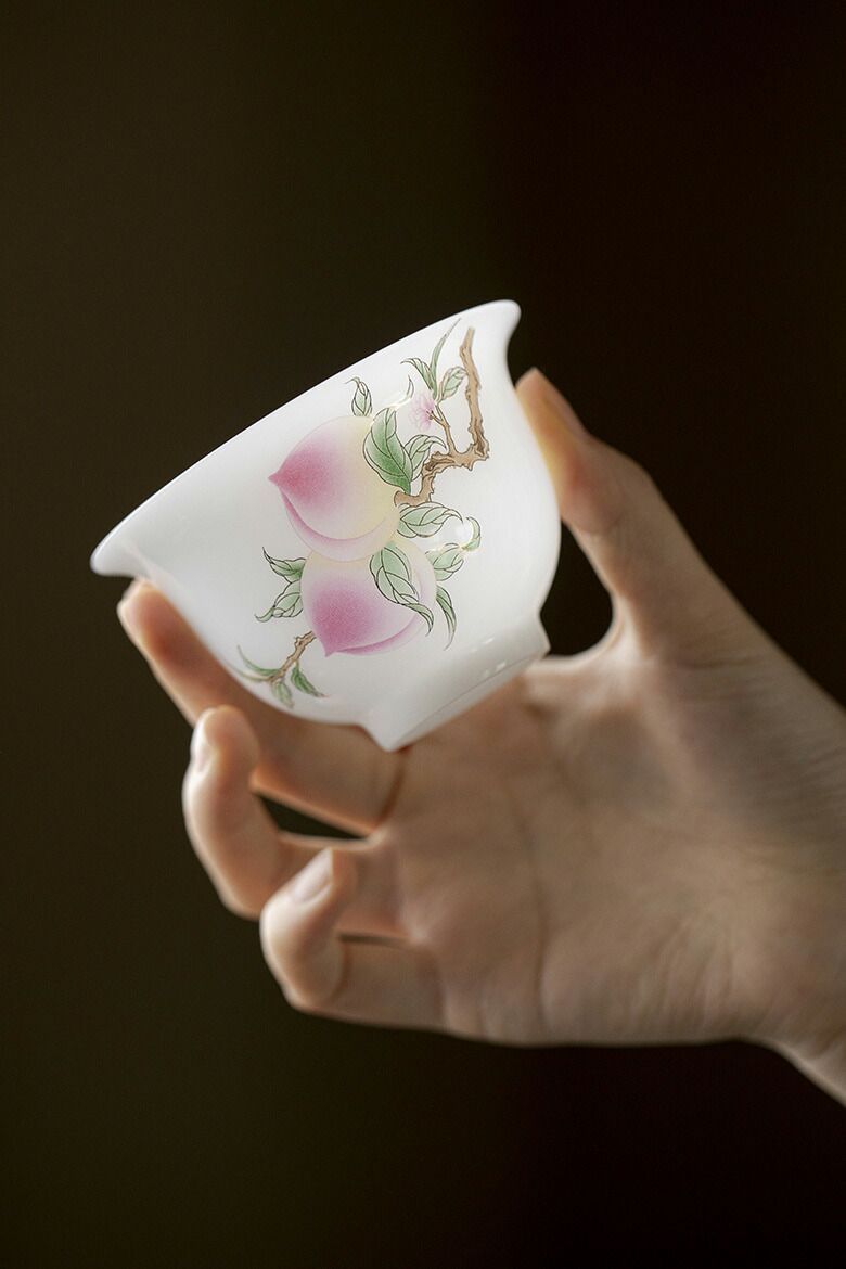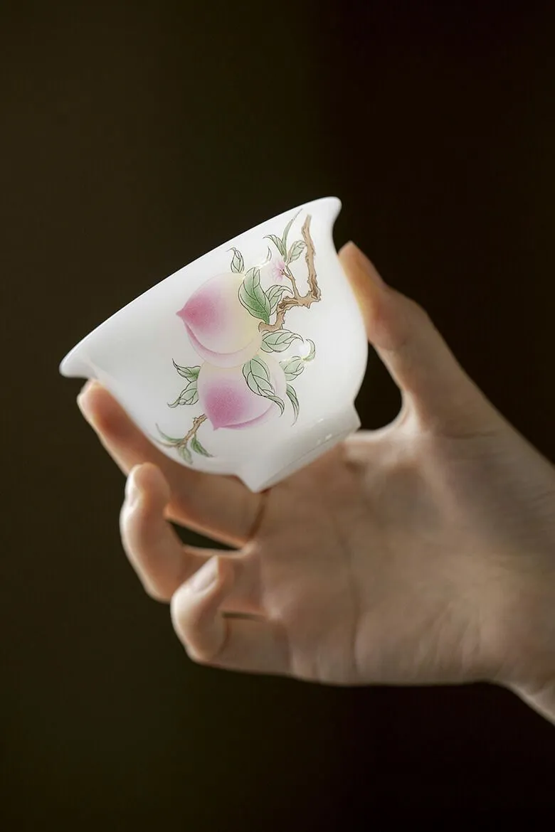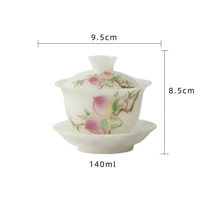みずみず しい桃の絵柄 桃 宝瓶 煎茶 茶器 茶碗 蓋物 スープ椀 スープボウル 蓋付 グラス 菓子椀 ボウル フリーカップ お碗 珍味入れ 宝瓶 抹茶茶碗 茶碗蒸し 蓋碗 茶器 手作り 中国茶器 景徳鎮 茶芸 140ml