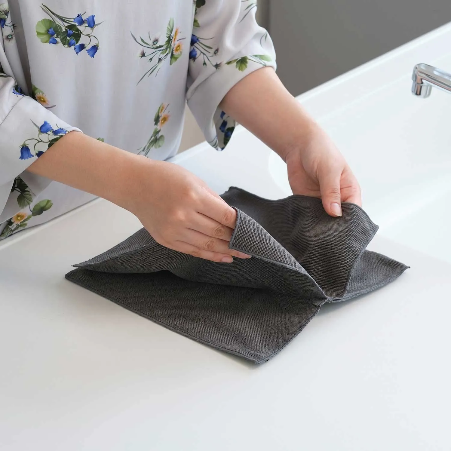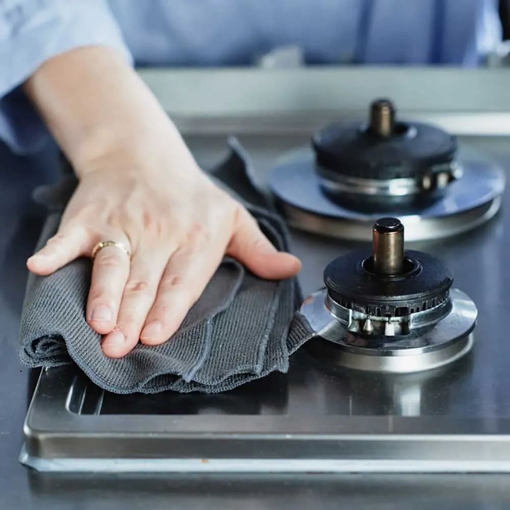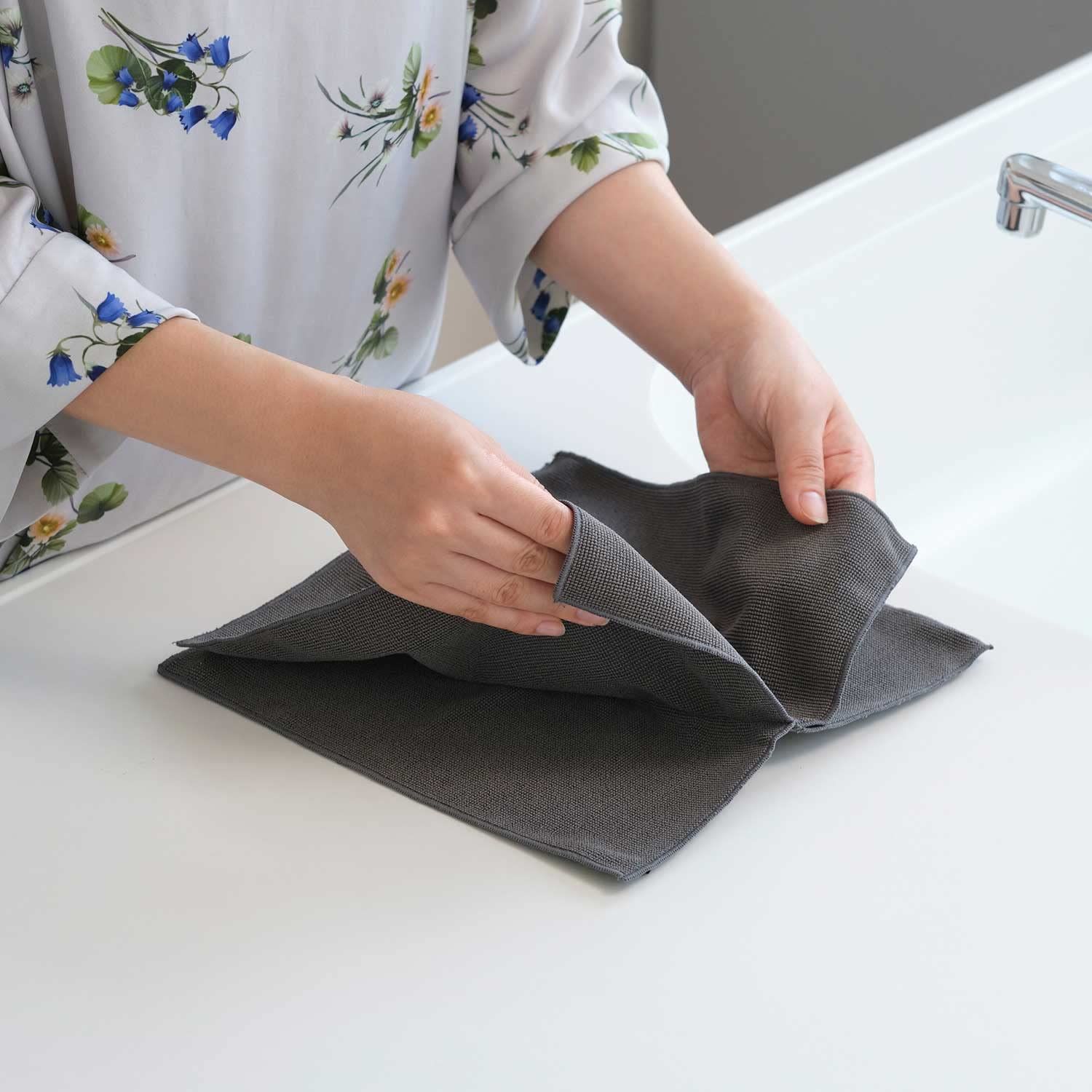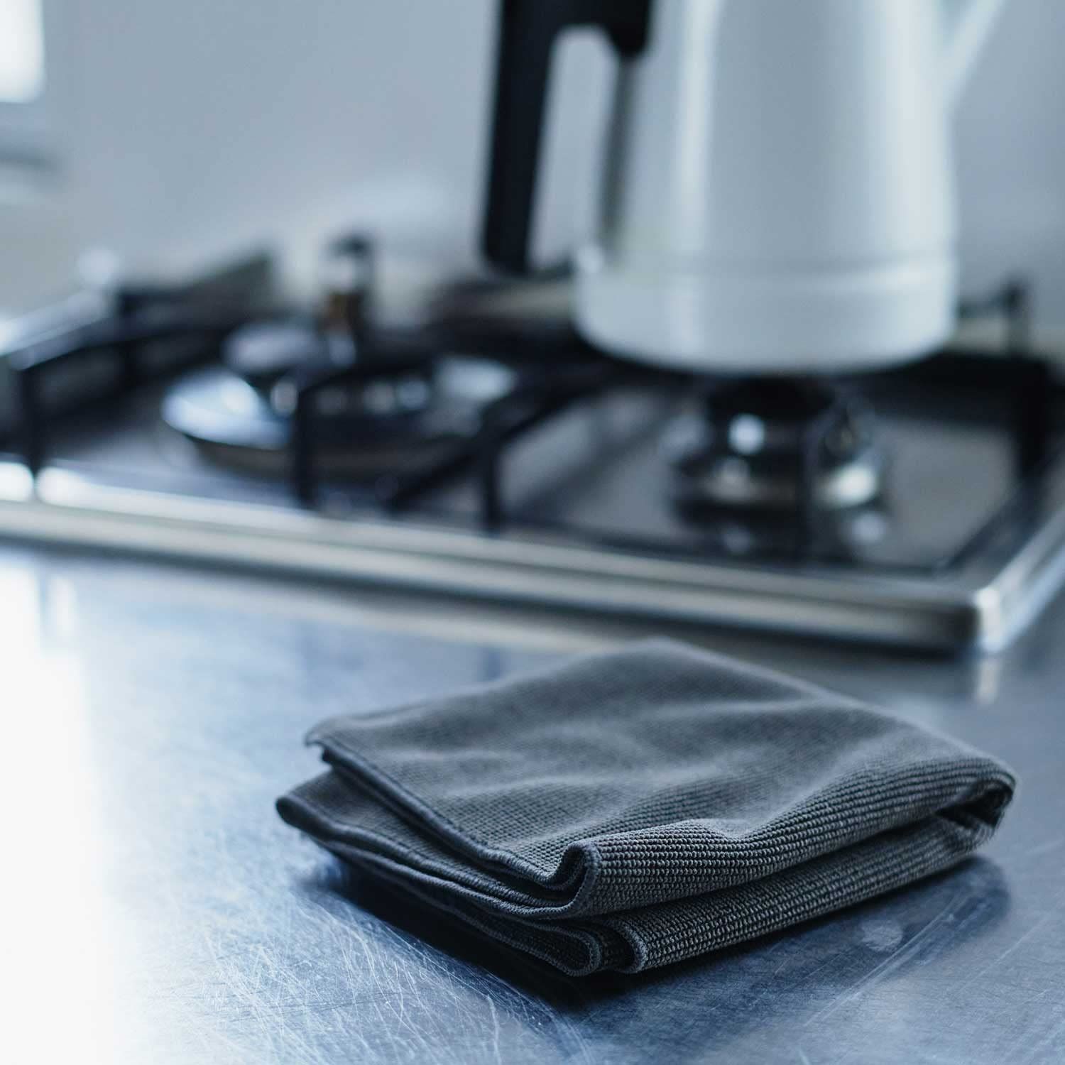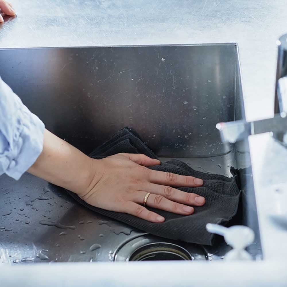 主婦インフルエンサー「心地よい暮らし研究会」とのコラボ企画。凹凸のあるパイル調クロスがキッチン廻りの水アカ、油汚れ、くもり汚れを掻き取ります。洗剤無しで油汚れも拭取れる、高性能国産マイクロファイバー使用。洗って繰り返し使用可能。優れた速乾性。
