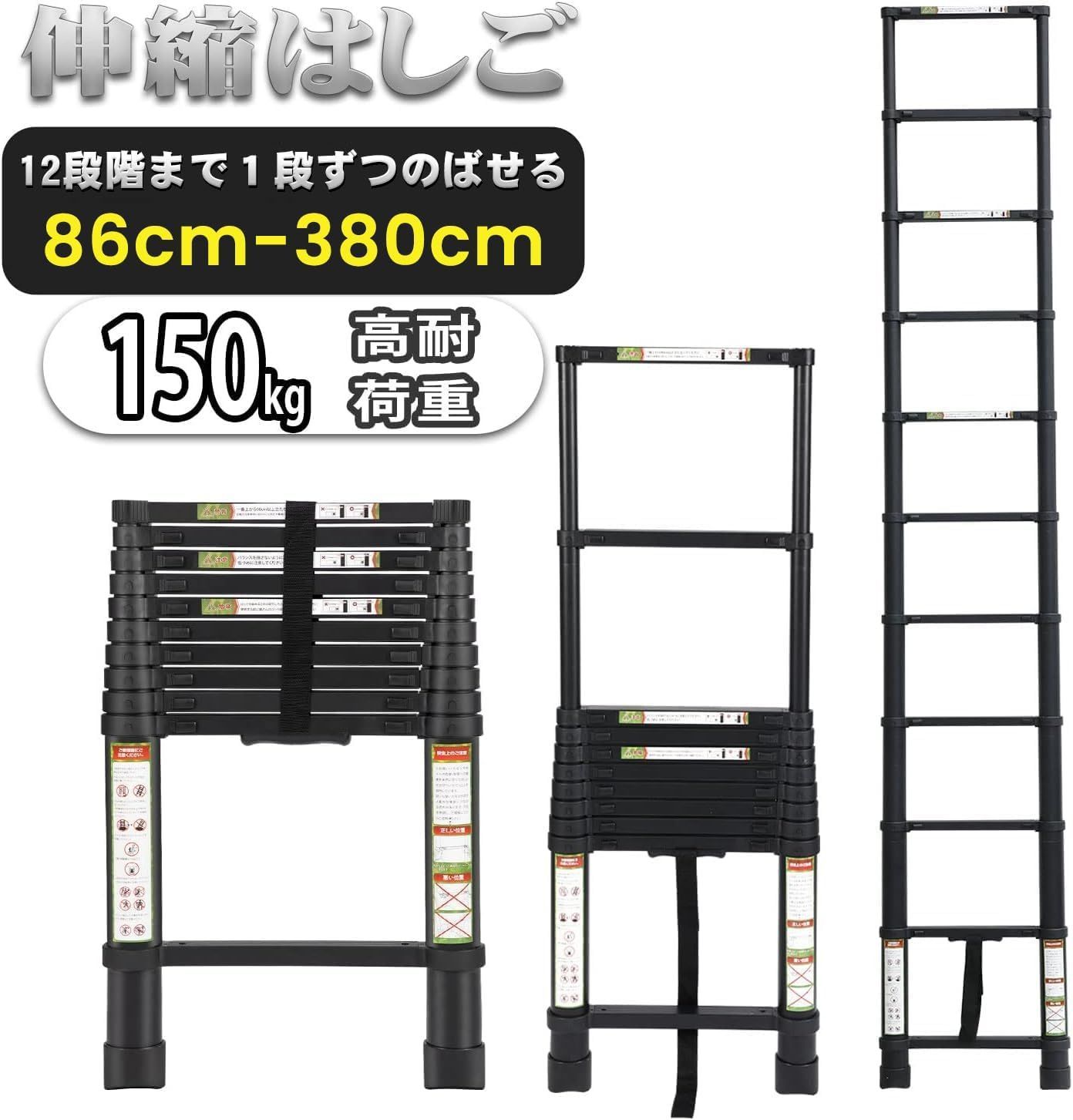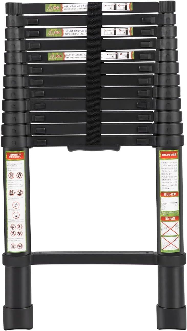 (04232ブラック, 3.8m)伸縮はしご 耐荷重150kg 軽量 持ち運びやすい 折り畳み 伸縮梯子 多機能アルミはしご 自動ロック スライド式 伸縮自在 梯子 室内室外両用 スライド式