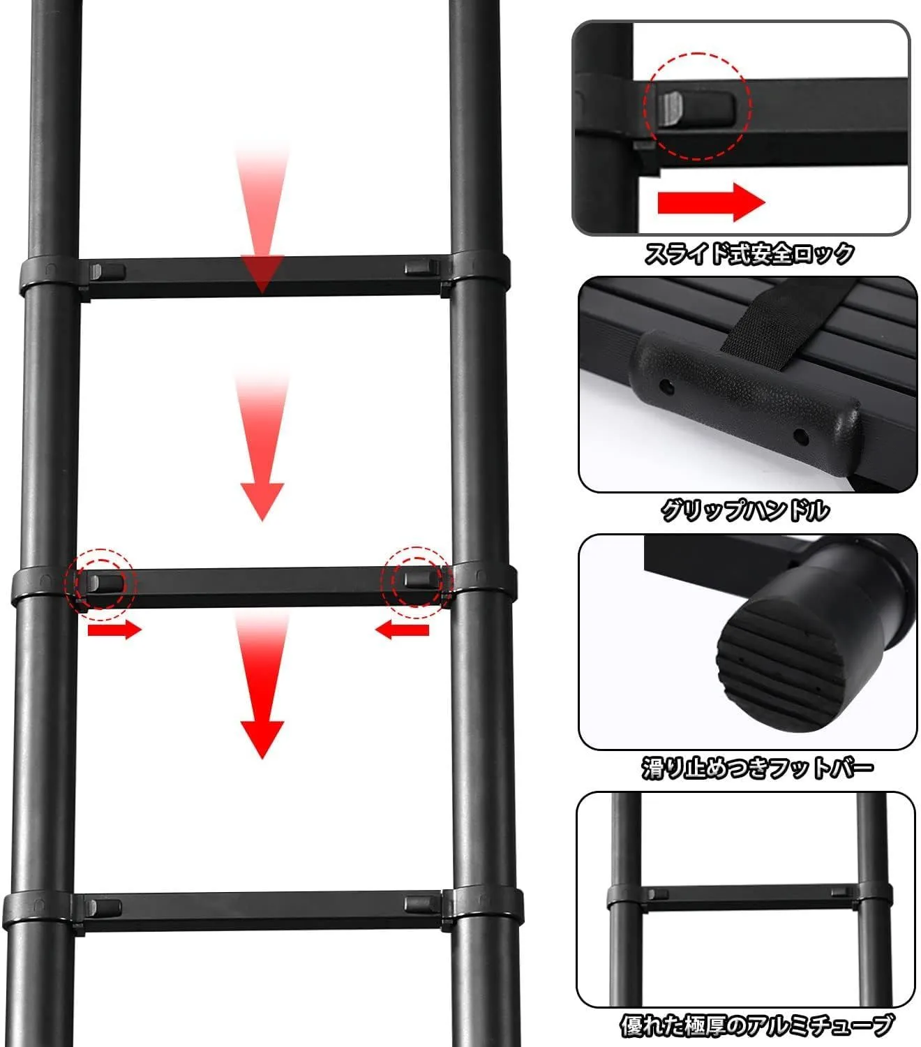 【揺れ防止、滑り防止】アルミ管を重ねて硬く揺れない。また、つま先は凸凹構造と円錐形滑り止め設計で、各層に独立したロックがあり、はしごの安定性が大幅に向上しました。