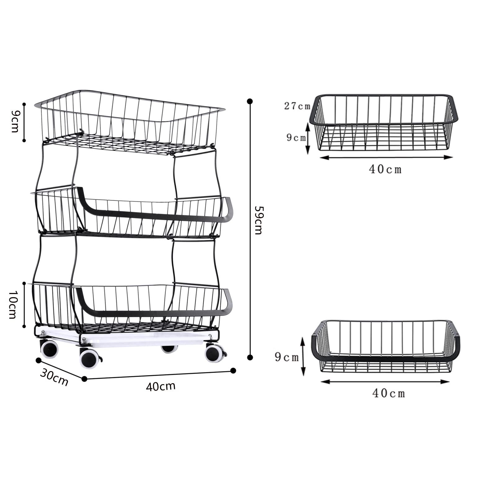 新品 BQKOZFIN スタッキングバスケット キッチンワゴン 収納カート 3段 ワイヤーバスケット 果物と野菜の保管 多機能収納バスケット キャスターとパッド付き ブラック