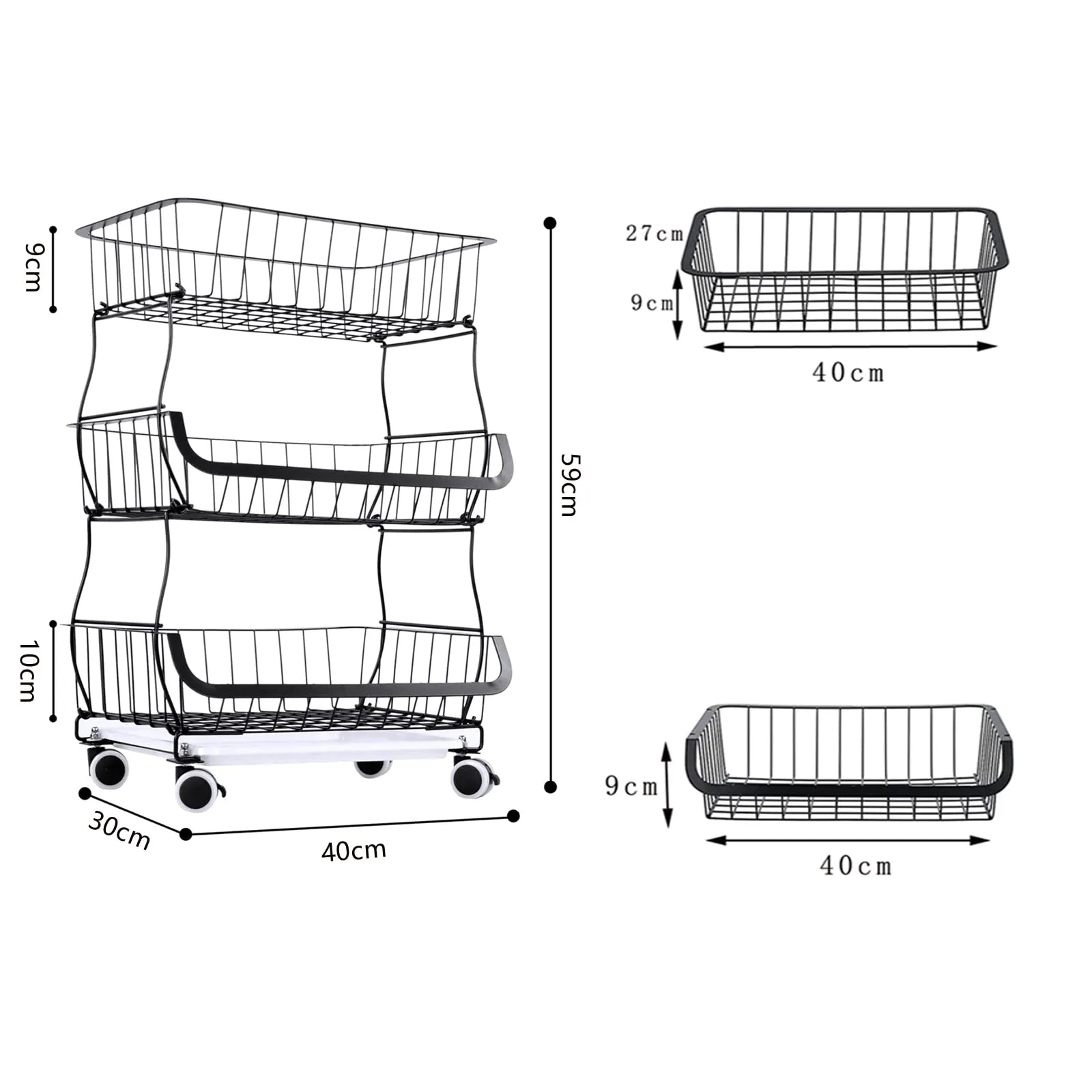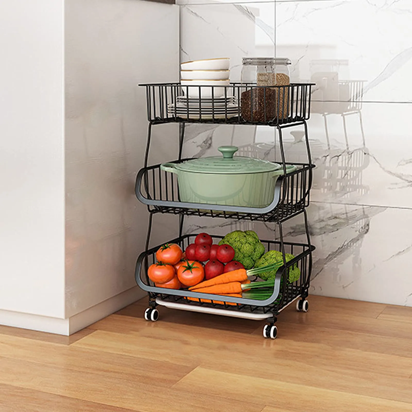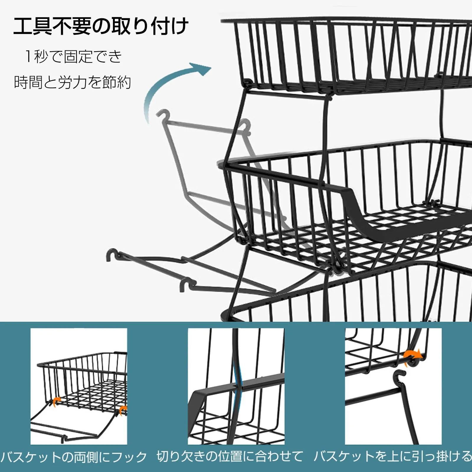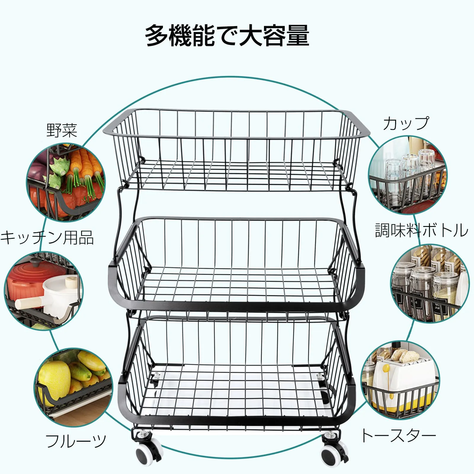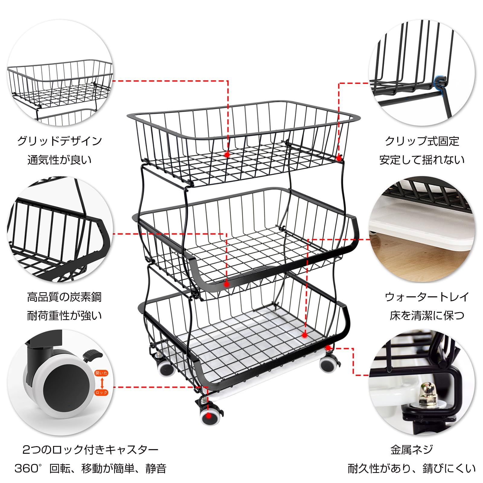 【多機能収納】果物や野菜、調味料やキッチンツールを整理整頓するための万能収納スタッキングバスケット。キッチンや家庭内のあらゆる場所で使用できる便利なキッチンワゴンです。ブラックカラーのシックなデザインがどんなインテリアにもマッチし、機能性とスタイルを兼ね備えています。