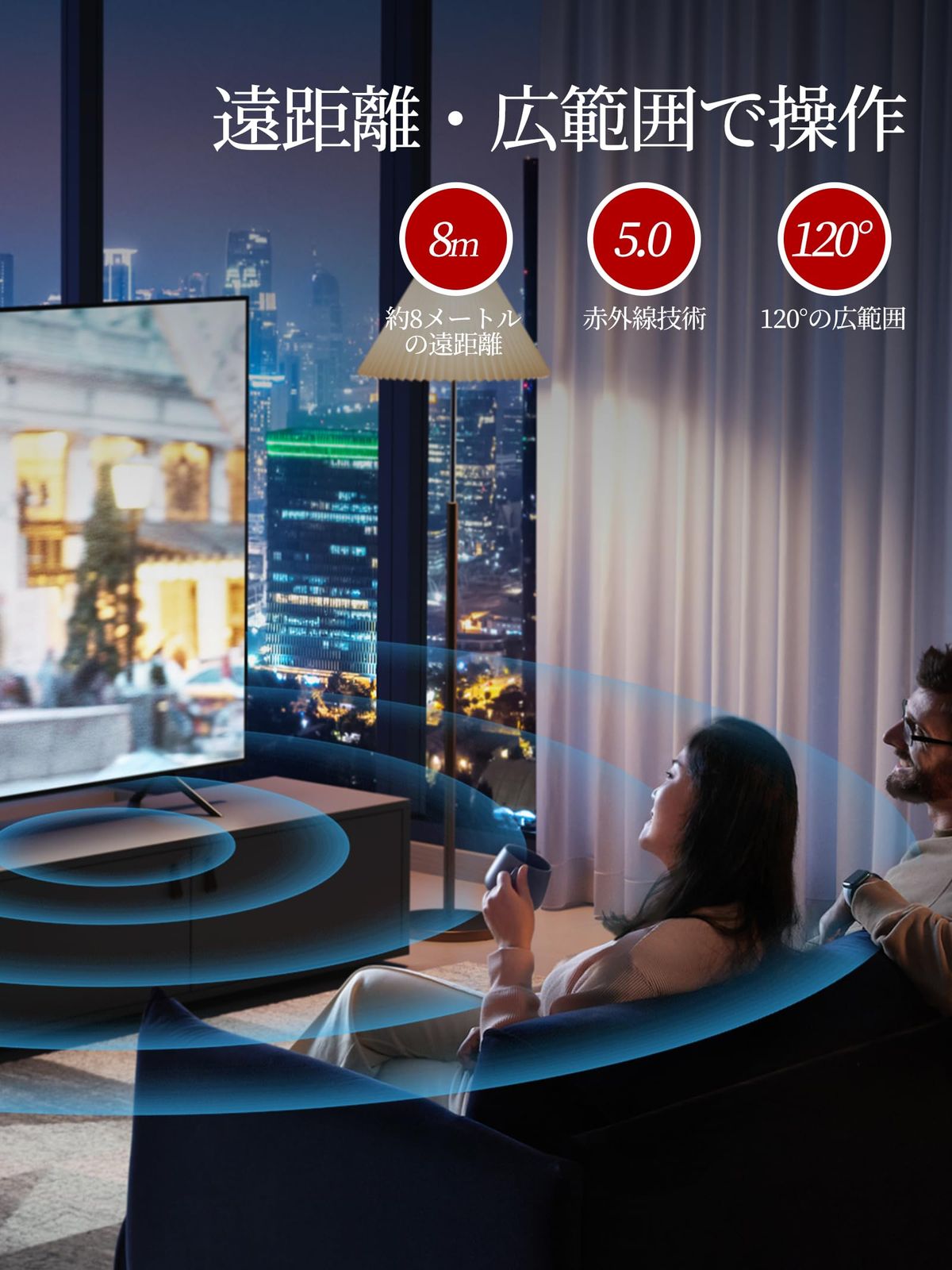 【長距離・広範囲で使用可能】強力な広角赤外線を搭載し、操作距離は約8メートル、左右の制御可能角度は約120度です。 距離や角度に制限されず、部屋の隅々からでも簡単に操作できます。