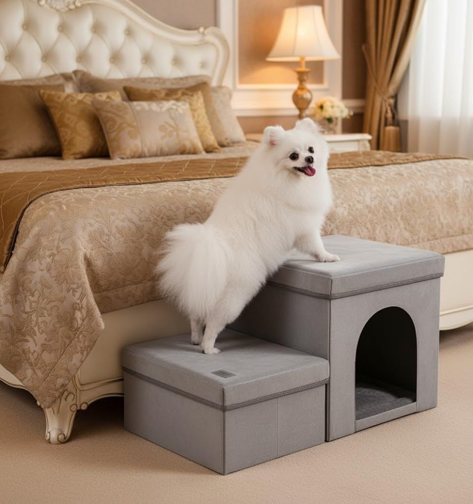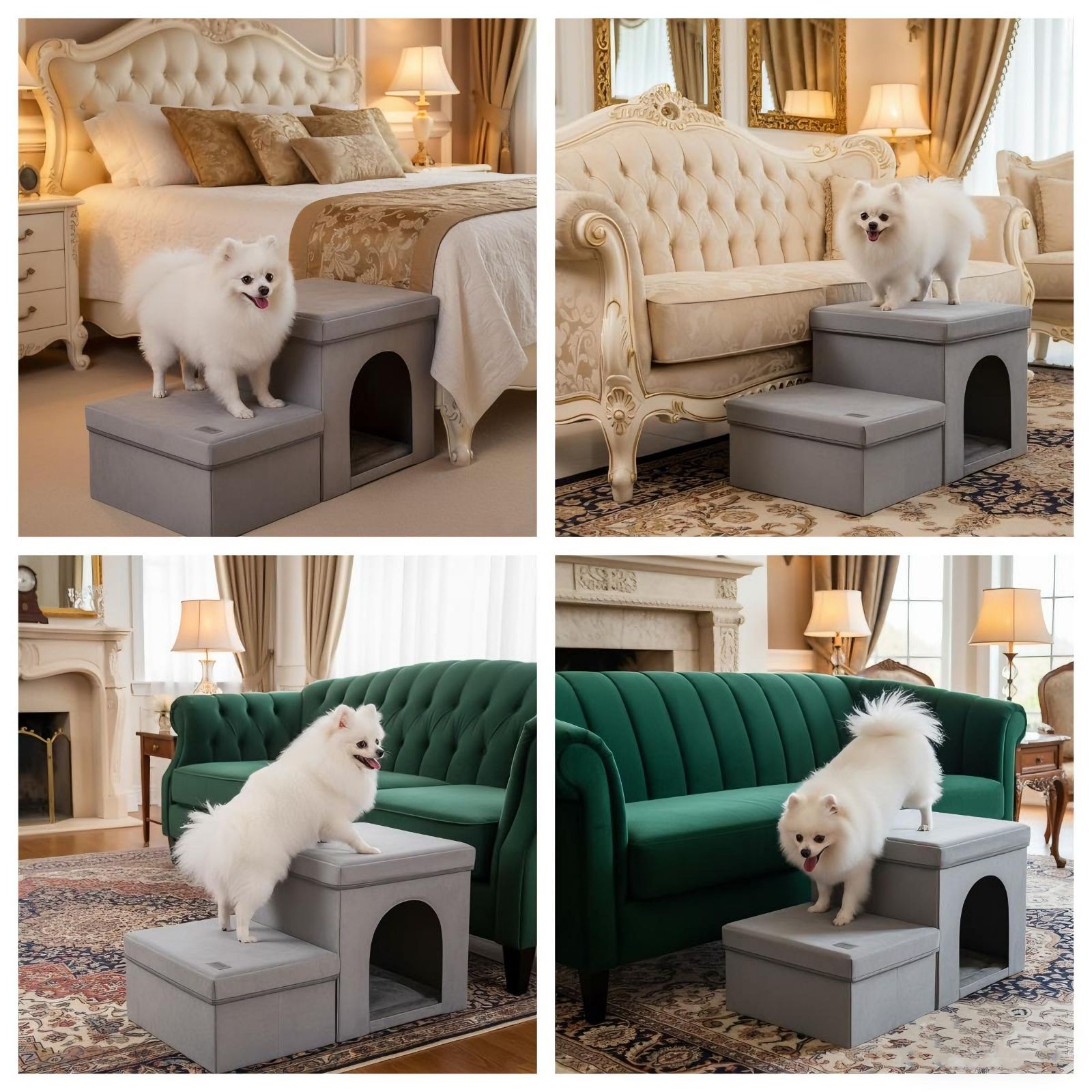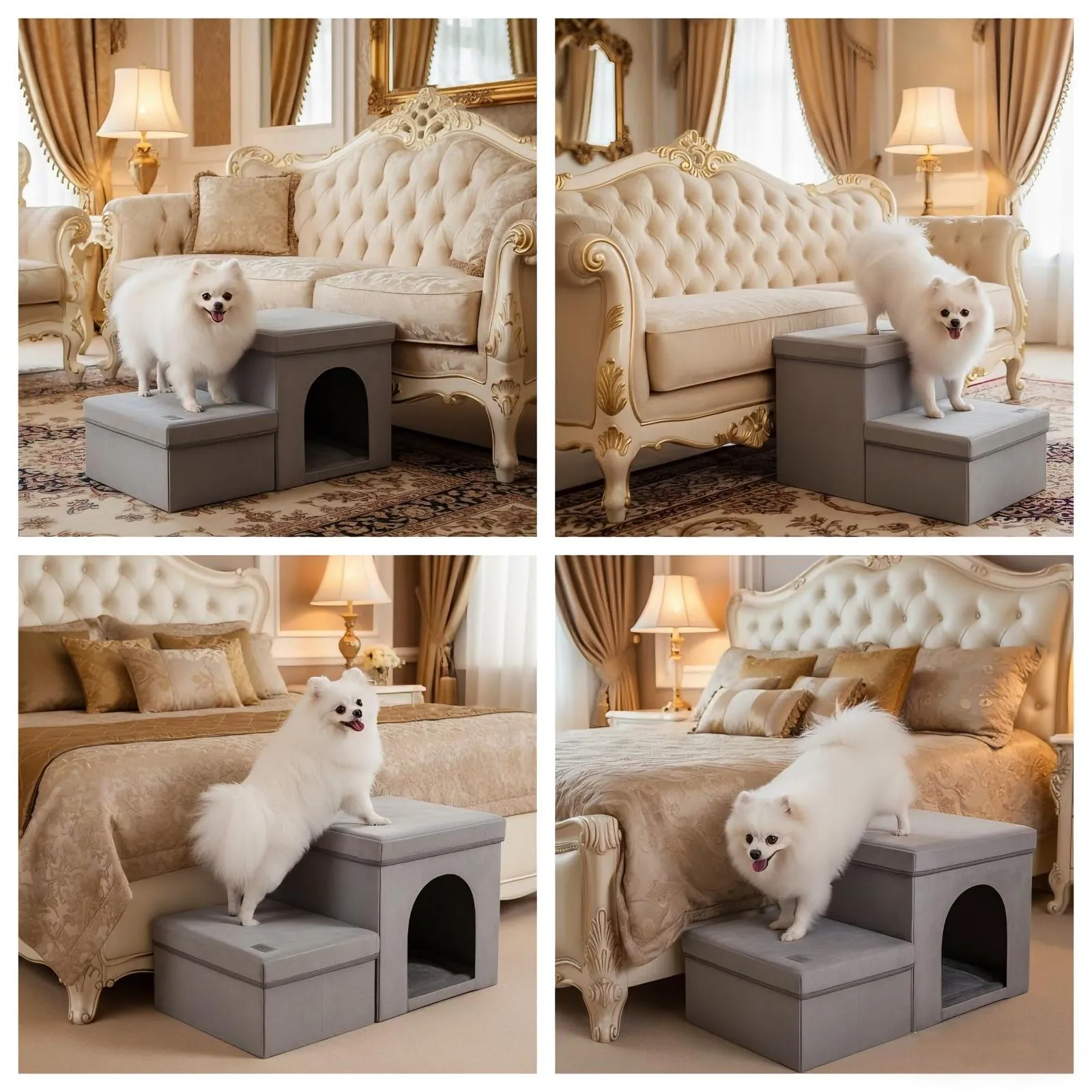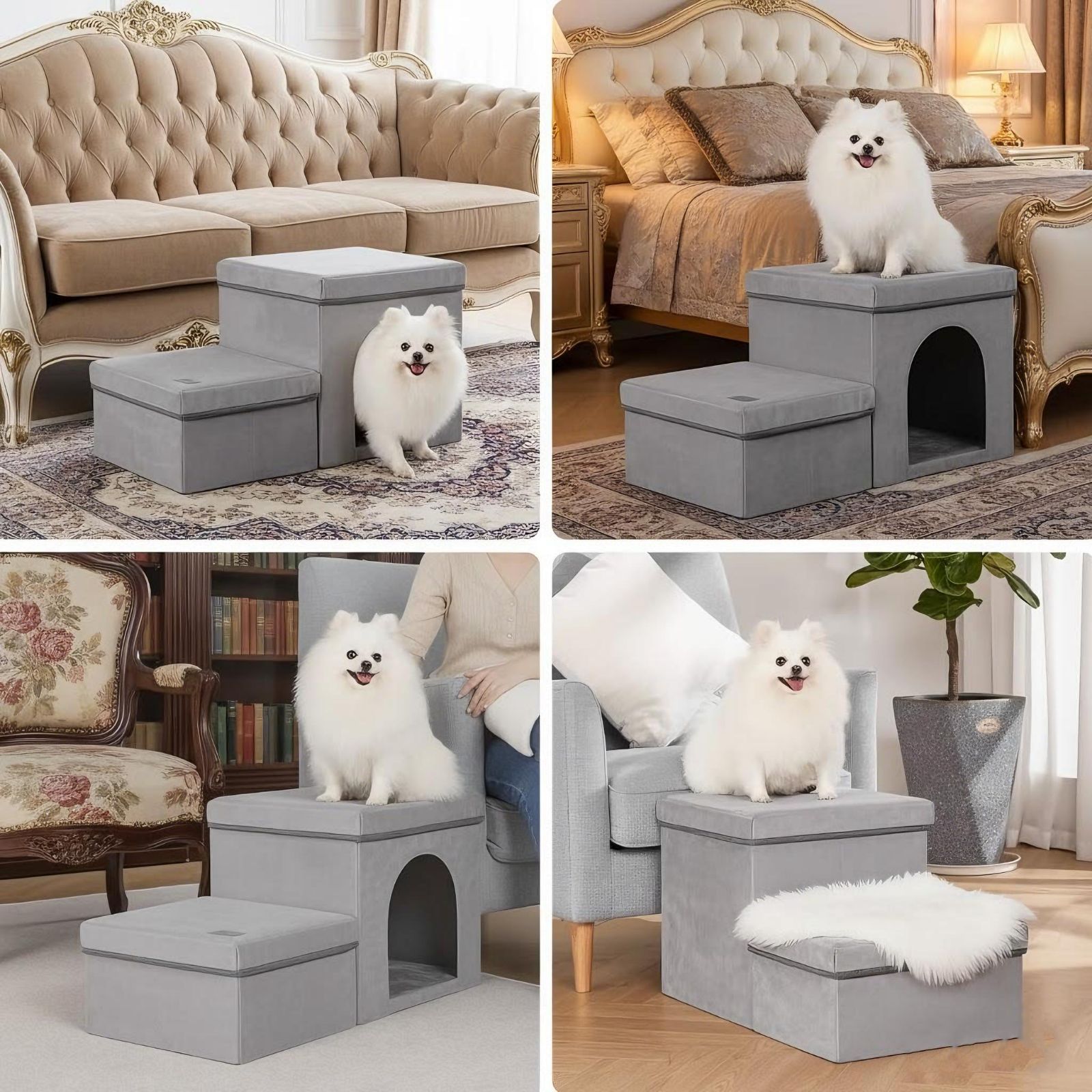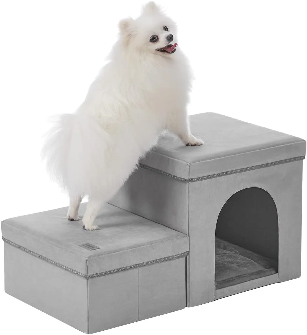 【特価商品】2in1ドッグステップ 猫ハウス 2段 折り畳収納型ペット用階段 高齢犬 シニア犬 スロープ 踏み台 介護用品 (灰)