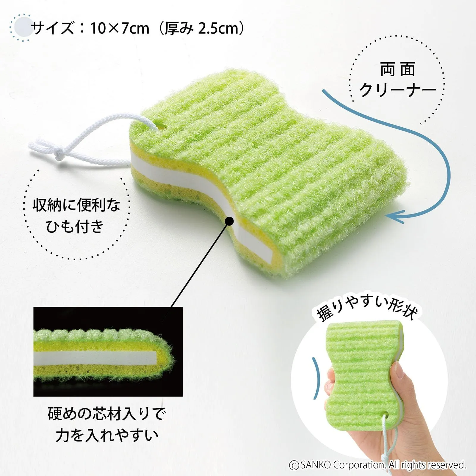 女性やお子様でも握りやすい形状とサイズ。クリーナーは、両面使用可能、硬い中芯を入れているので力を入れて洗いやすくなっています。