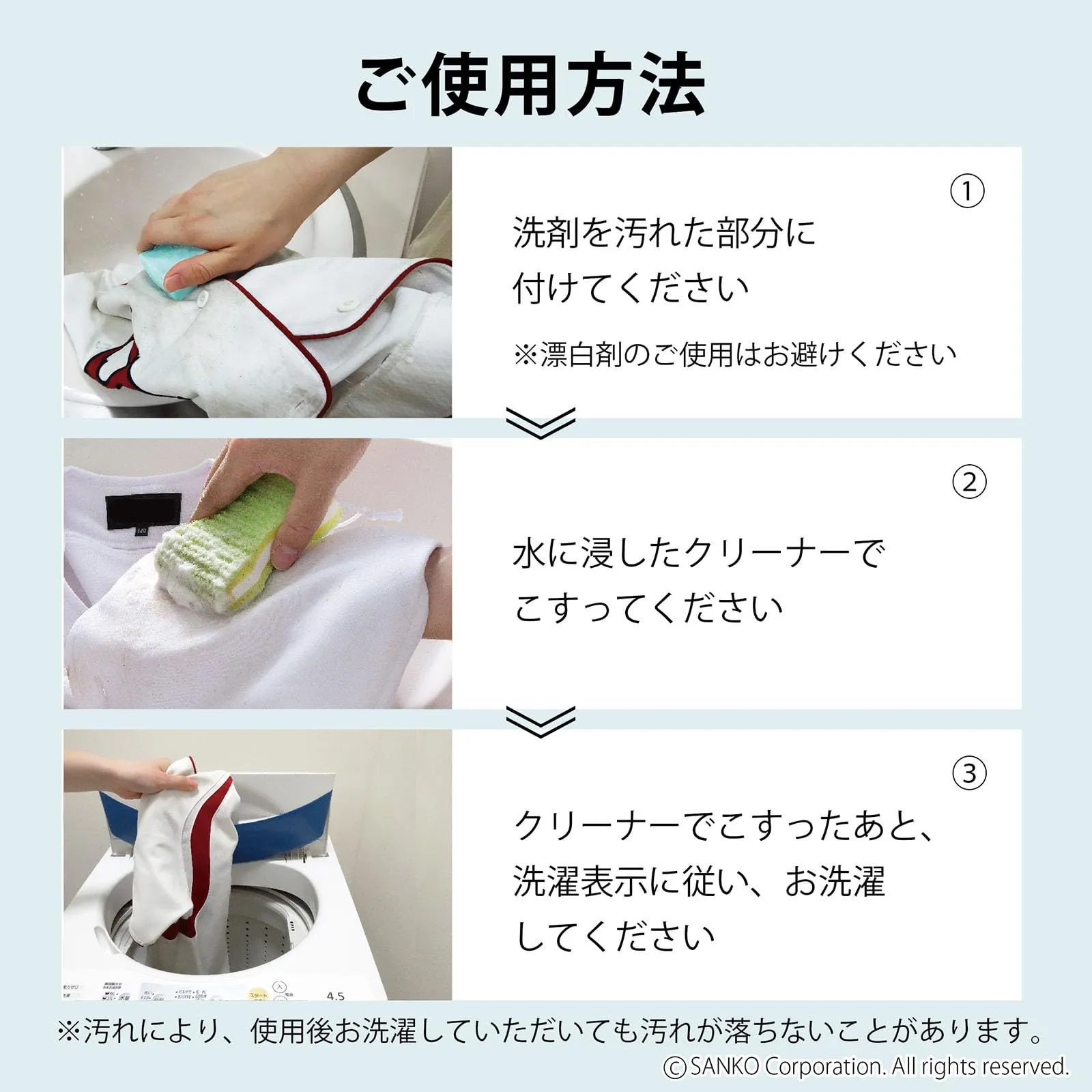 【使用方法】洗剤を落としたい汚れにつけた後、水に浸したブラシ(本品)でこすってください。その後、洗濯機の表示に従い洗濯してください。