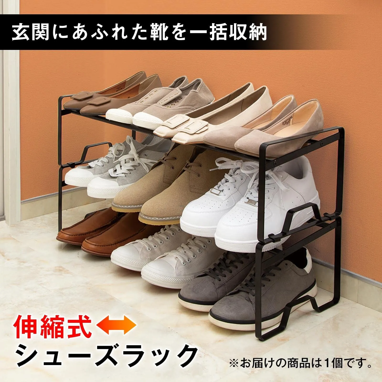 コモライフ 伸縮式 シューズラック 1台 スリム 靴箱 収納 フレーム 下駄箱 棚 靴置き すべり止め 積み重ねOK