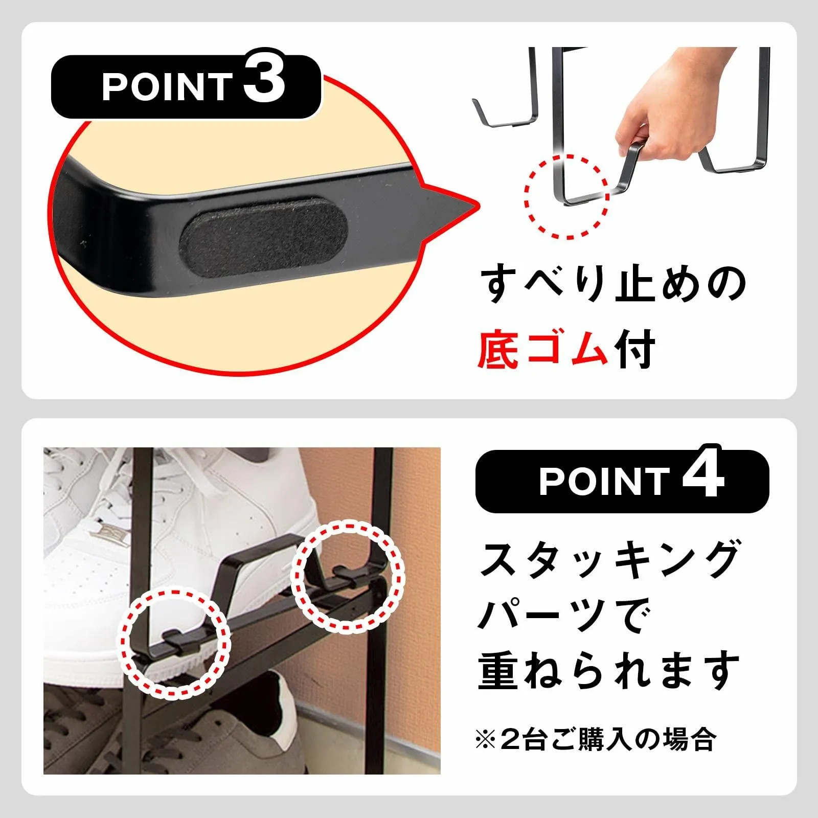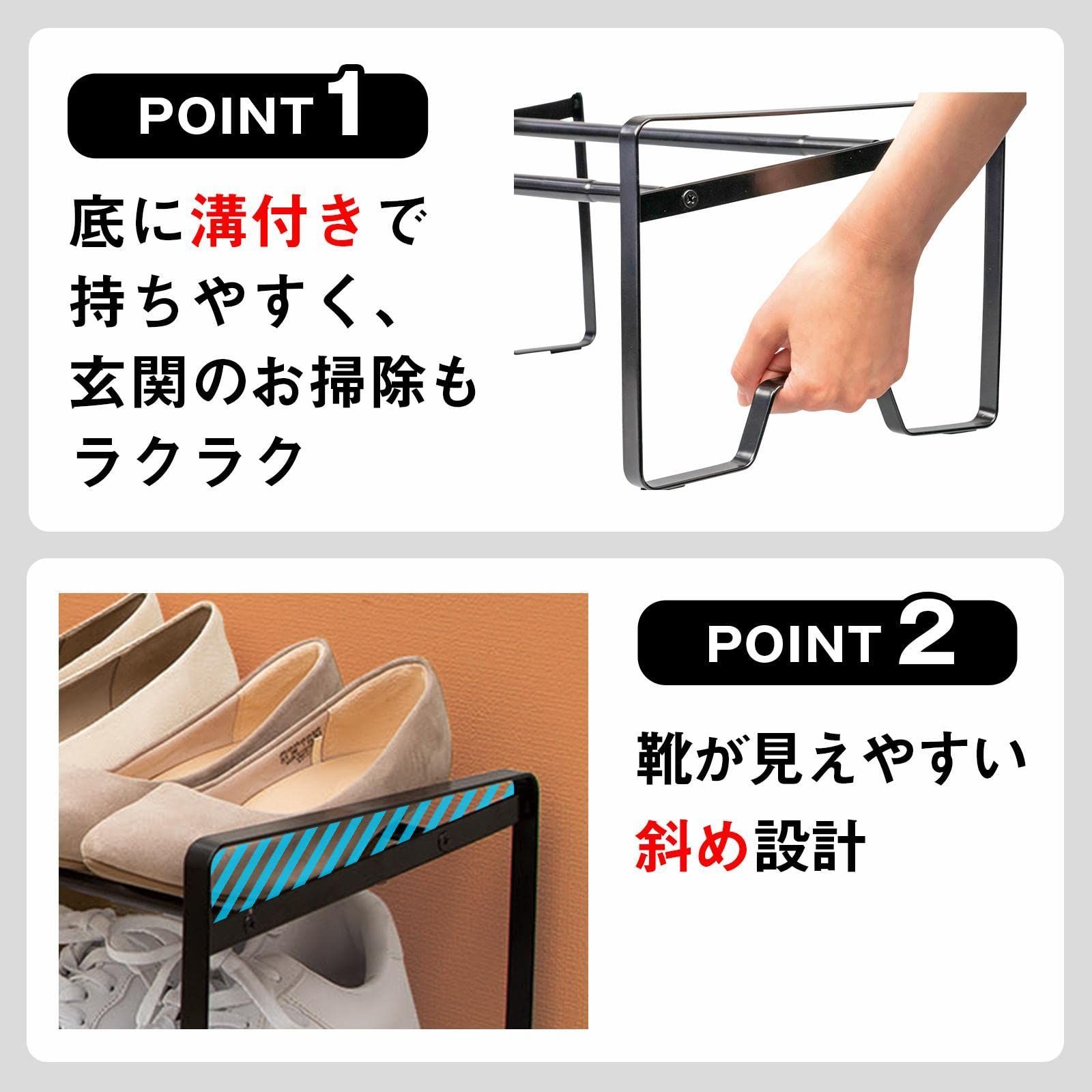 【耐荷重:約3kg】 収納目安(最大時):男性シューズ/約6足、女性パンプス/約8足 セット内容:左フレーム×1個、右フレーム×1個、伸縮パイプ×2個、ネジ×4個、スタッキングパーツ×2個 玄関のごちゃごちゃをスッキリ解決!伸縮式なのでお好みの幅に設定でき、下駄箱下のスペースも有効活用できる優れものです。 底にはすべり止めのゴム付、また溝があることで持ち運びにも便利です。 スタッキングパーツ付なので、もう1セットご購入していただくことで2段に連結することが可能です。 仕様/耐荷重:3kg サイズ/約幅41~70×奥行25×高さ18.5cm(組立時) 個装サイズ/約41×28×2.5cm 個装重量/915g 素材・材質/スチール(エポキシ粉体塗装) セット内容/左フレーム×1、右フレーム×1、伸縮パイプ×2、ネジ×4、スタッキングパーツ×2 安全警告 このシューズラックの耐荷重は約3kgです。正しい方法でねじ込み式に取り付けてください。 最後までご確認頂き誠にありがとうございました。 上記をご確認頂き、ご購入いただけましたら幸いです。 何かご不明な点がございましたらお気軽にメッセージからお問い合わせ下さい。