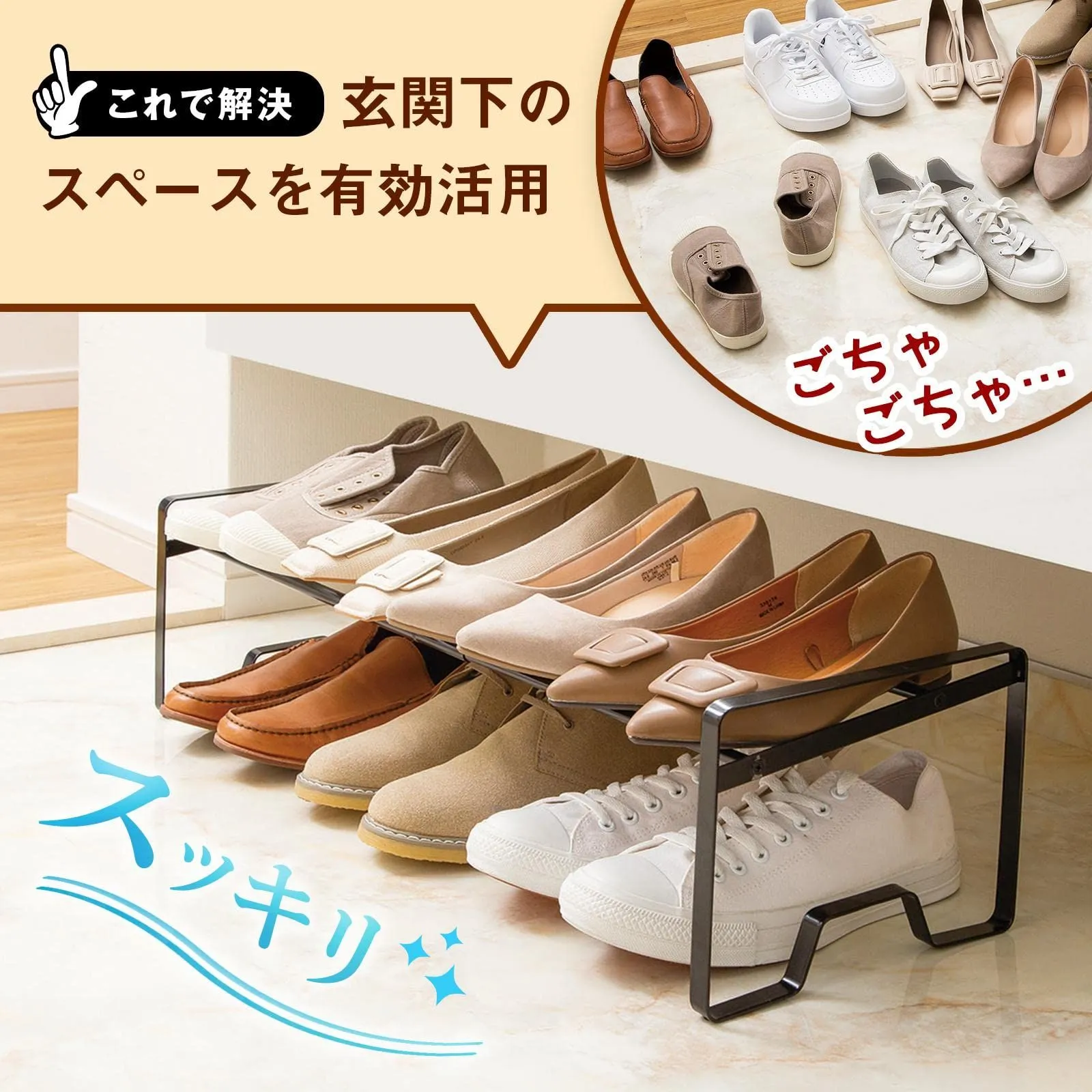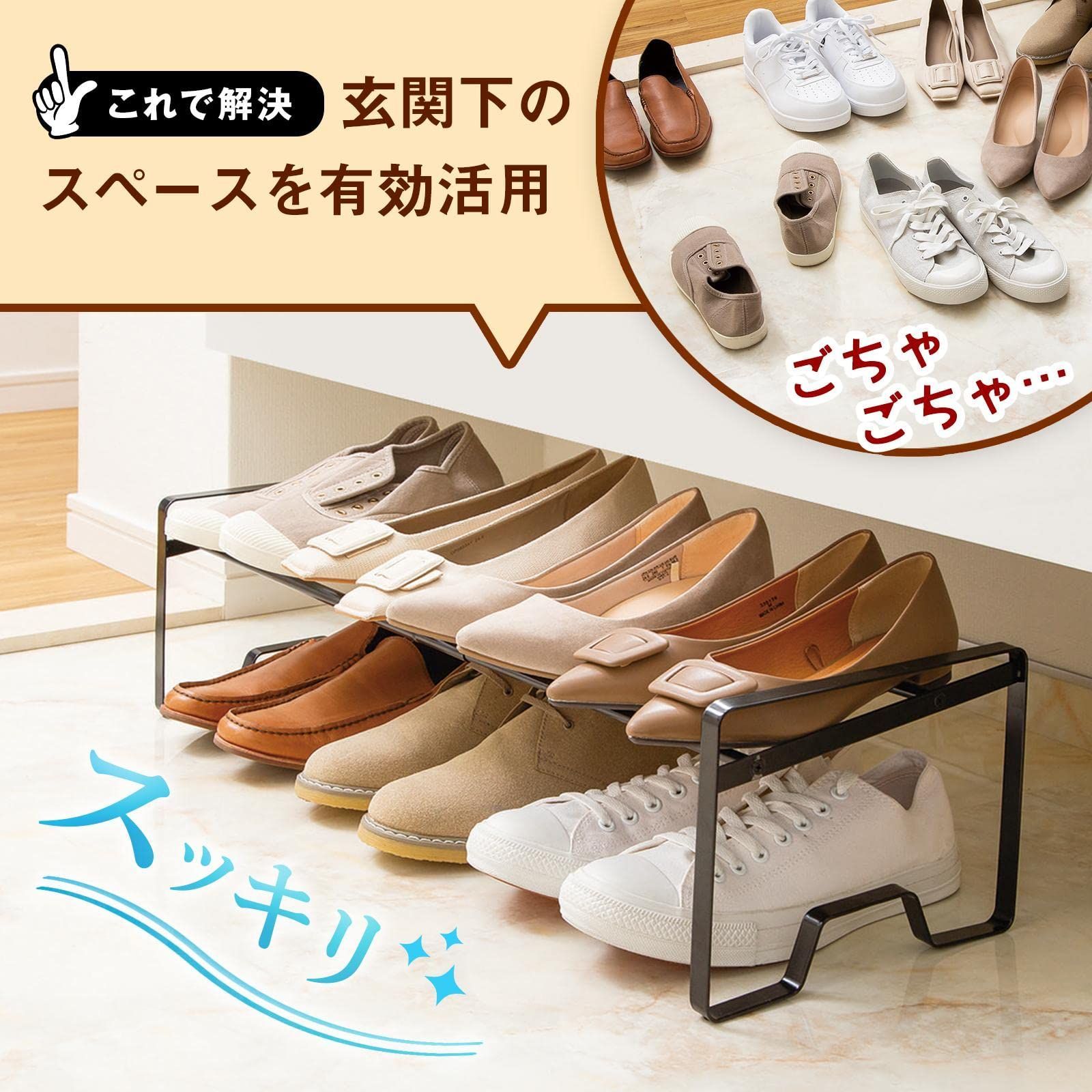 あふれた靴を簡単収納!伸縮できるシューズラック!