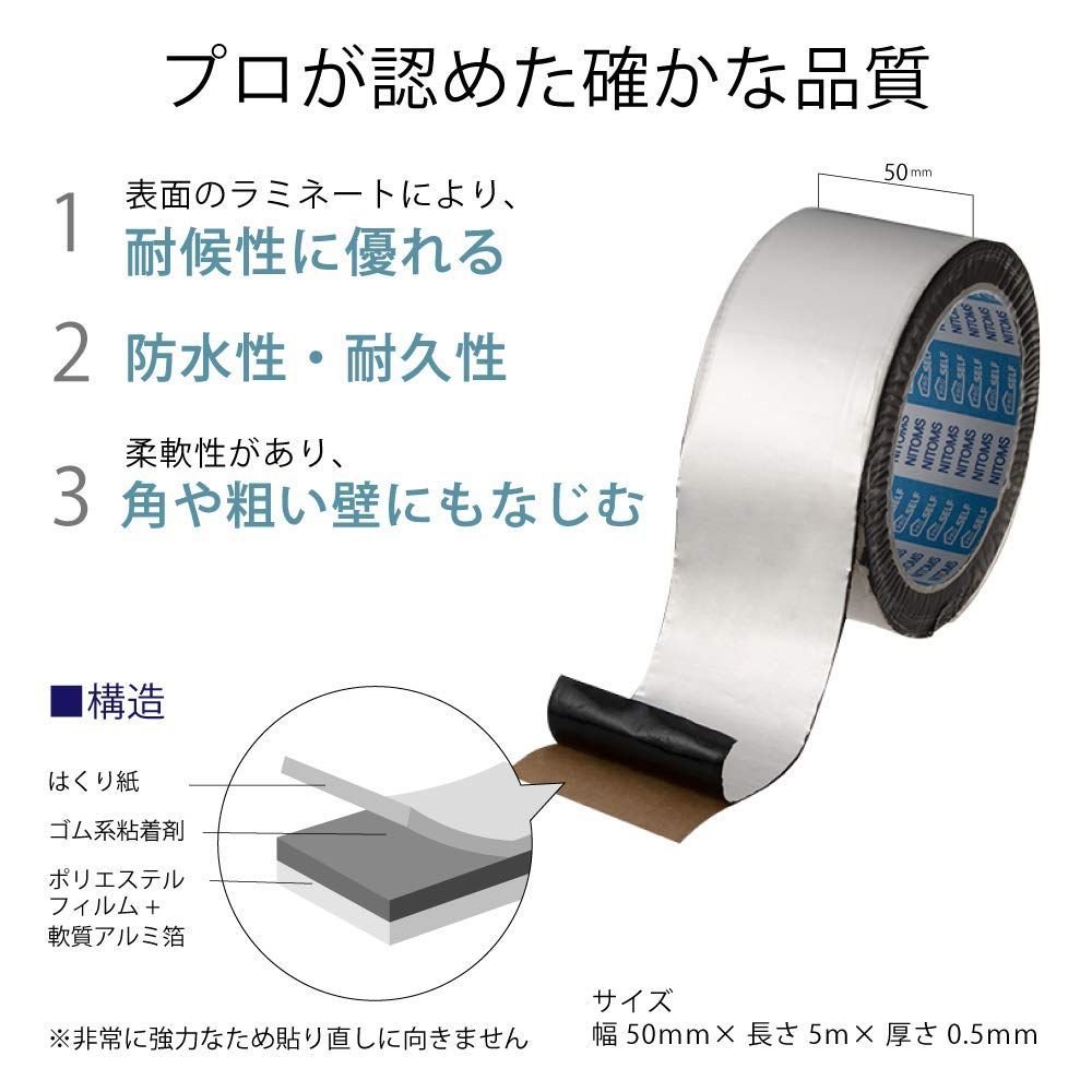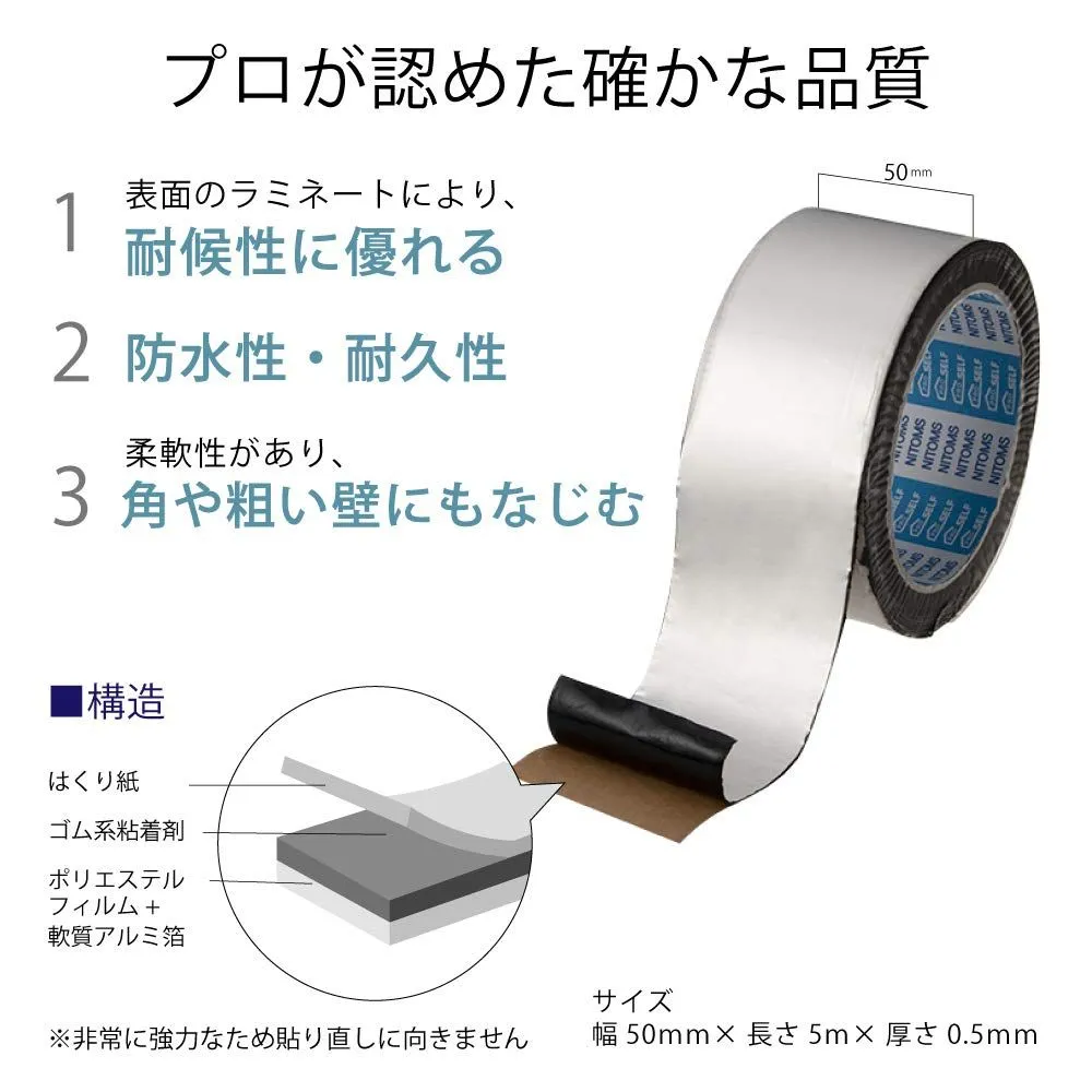 ニトムズ(Nitoms)PROSELF(プロセルフ) 防水アルミテープ ブチル トタン 修理 補修 防水 幅50mm×長さ5m×厚さ0.5mm 1巻入 シルバー J2170