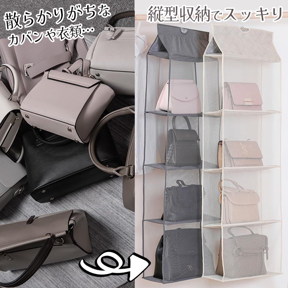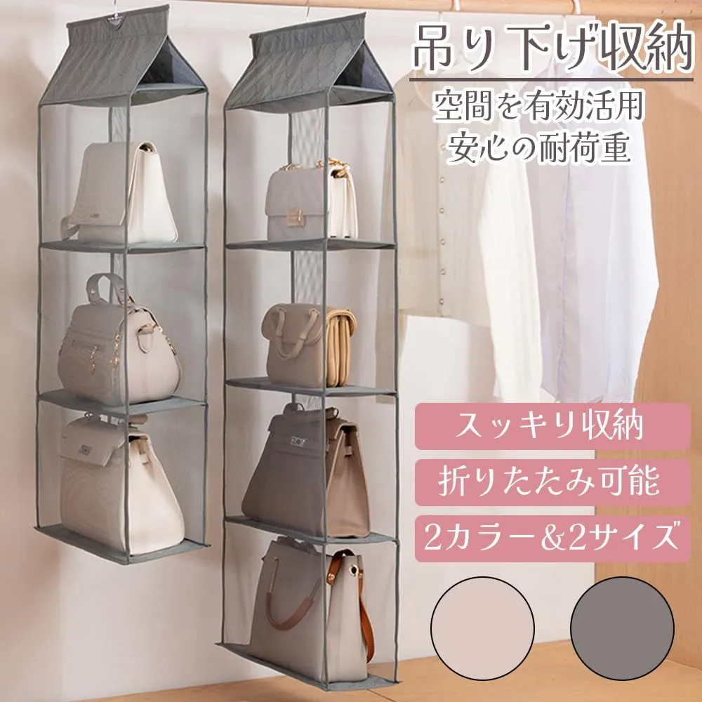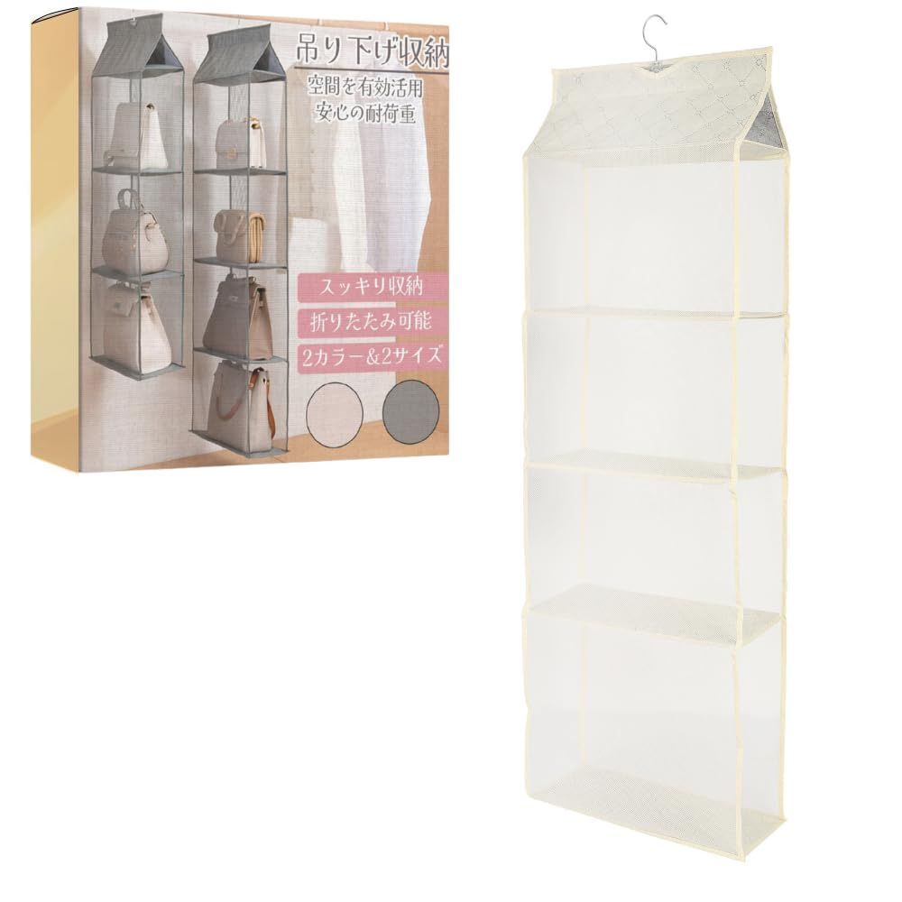 ideamall 吊り下げ収納 折りたたみ バッグ収納ラック カバン収納 バッグ ハンガー クローゼット 収納 バッグハンガー 型崩れ防止 省スペース 防湿 防カビ すっきり収納 インテリア雑貨 片付け 整理 整頓 (4段式 ベージュ)