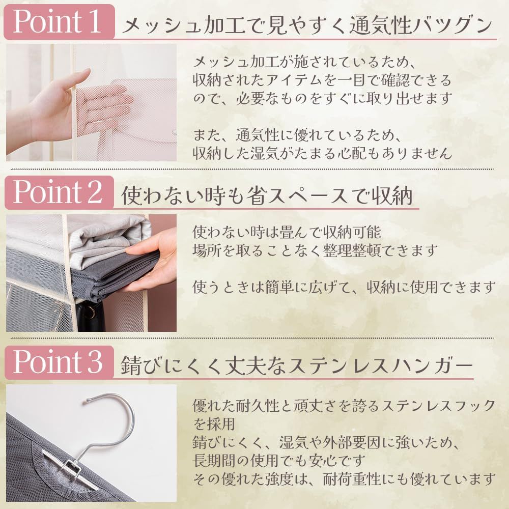 【ハンガーフック付】クローゼットでの取り付け・取り外しが簡単です。ハンドバッグ、レザーバッグから籠バッグまで時期によって使わないカバンをたくさん収納できます。たたんで旅行に持っていきます、ホテルなど限られたスペースしかない時は役立ちます。