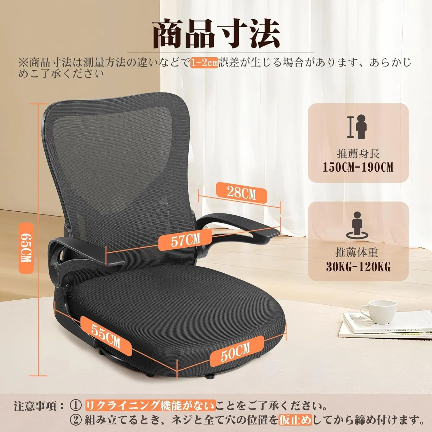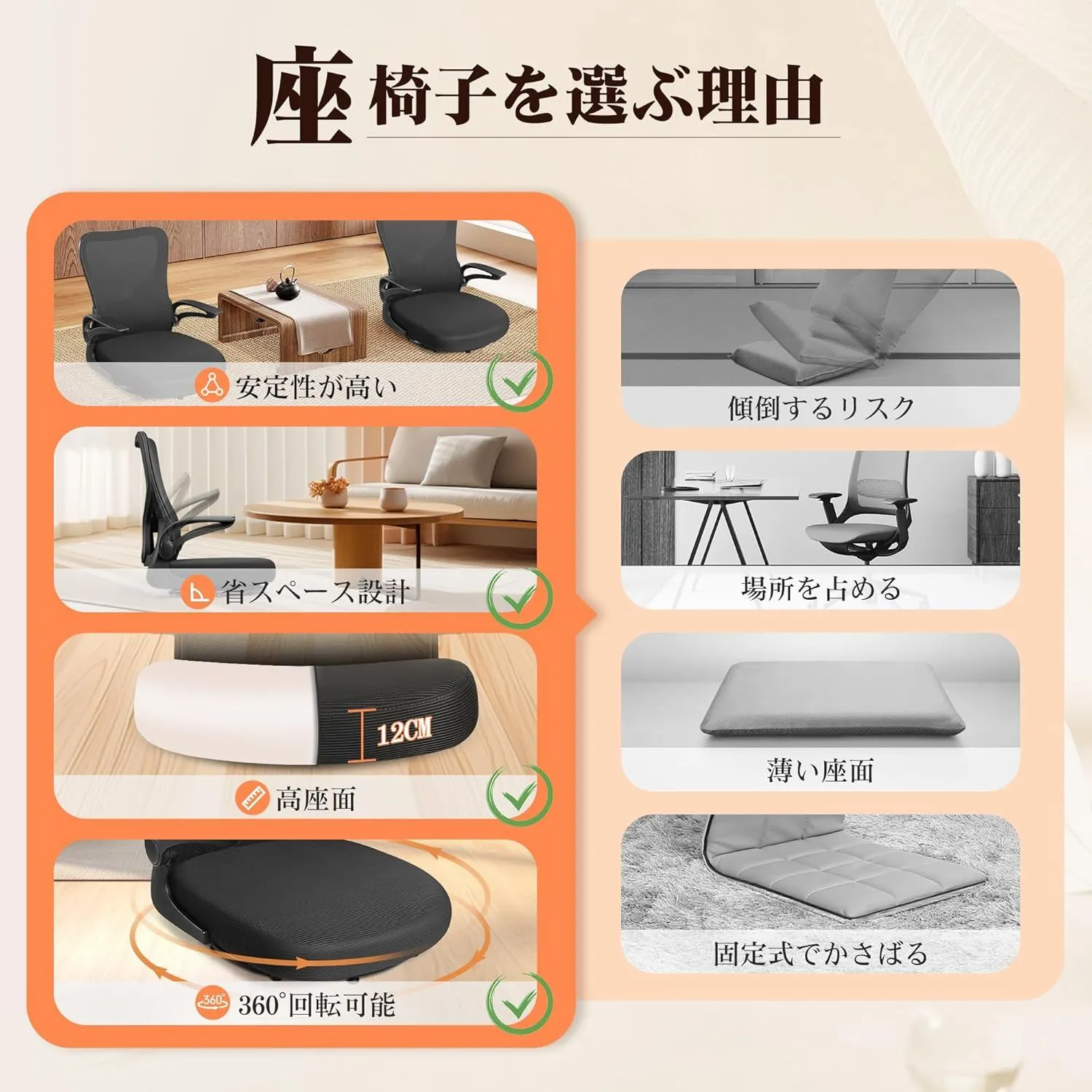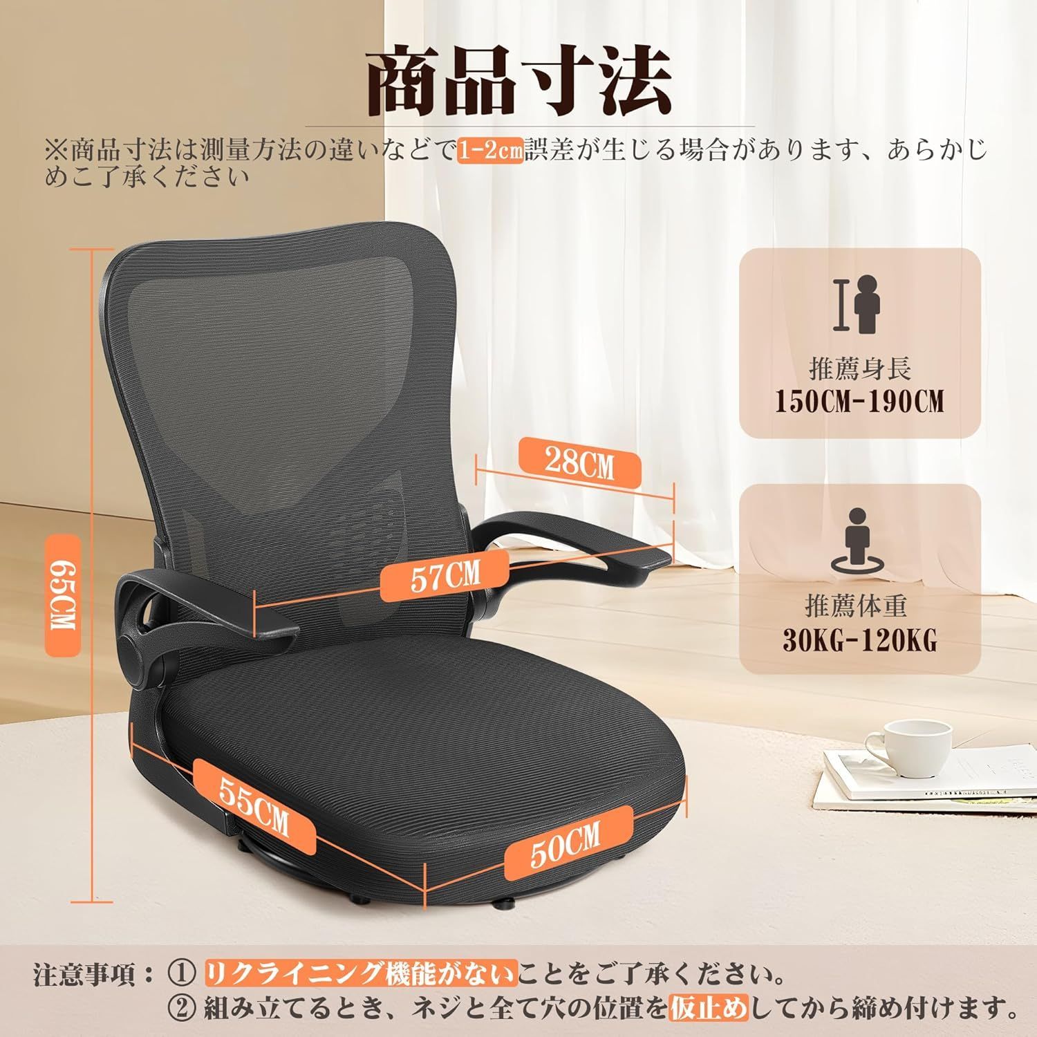 【革新的なデザイン】座椅子と普通なオフィスチェアの完璧な組み合わせ。 調整可能なアームレストを装備して、机の下に省スペースで収納でき、狭い部屋にも大活躍になります。本体は9.35kg、耐荷重120kg、10分簡単組み立できます。