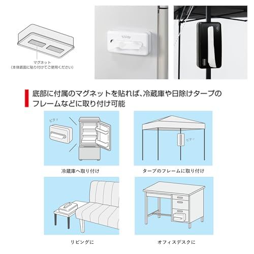 底部に付属のマグネットを貼れば、冷蔵庫や日除けタープのフレームなどに取り付け可能。