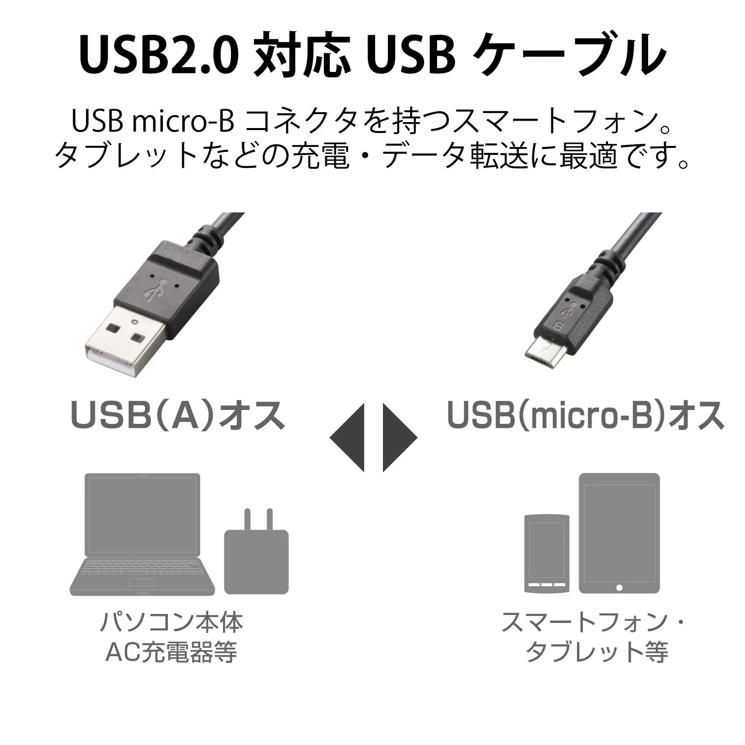 ■USB(Aタイプ:オス)のインターフェースを持つパソコンにUSB(MicroBタイプ:オス)のインターフェースを持つスマートフォンなどの機器を接続し、充電やデータ転送ができるMicro-USBケーブルです。